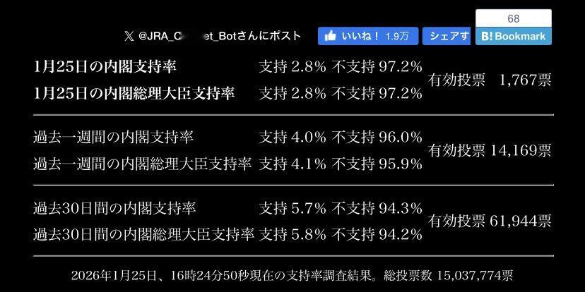 日本人现在真的恨死高市这个老妖婆了,比谁都恨这次老妖婆支持率再次大幅度下跌,连虚高的假数据,支持率都跌了10个百分点,她擅自解散众议院白白花掉了850亿日元,而为了弥补政府预算,硬是把保险费高额辅助限度额给提高了,硬削了700亿预算,日本人恨她到骨子里了,完全不顾老百姓死活的那种作妖顺便说下,她网上真实的支持率,不到3%