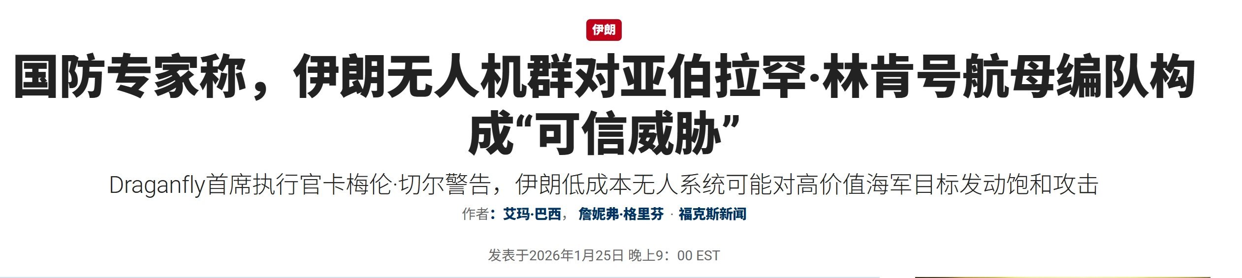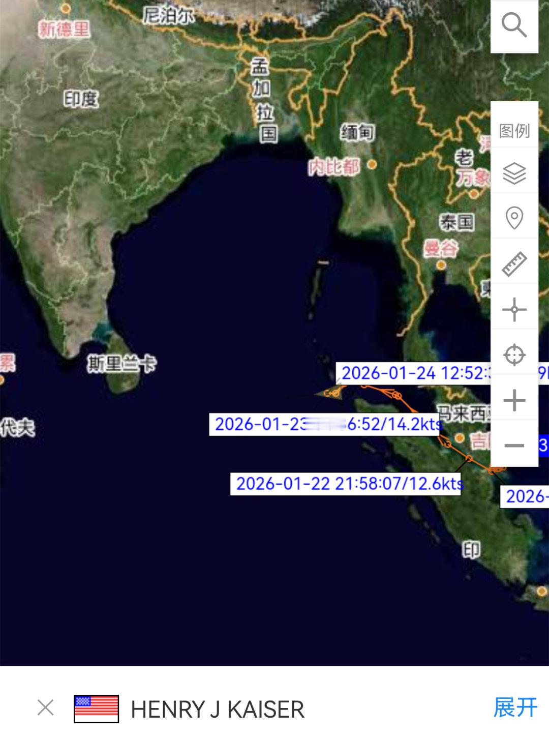 军事专家:伊朗无人机可突破林肯号防御——1月26号,福克斯新闻报道,美国一名高级官员表示,美国海军林肯号航母(CVN-72)尚未抵达中央司令部辖区,“它很接近,但技术上还不属于中央司令部”。如果报道属实,那林肯号目前大概率位于印度西南方向的印度洋(参考图2)。同时林肯号航母打击群会是在等待亨利·凯泽尔号舰队油船(T-AO-187)进行海上补给。后者在1月24号刚刚通过马六甲海峡进入印度洋,目前可能抵达印度或斯里兰卡南部。(参考图4)福克斯同时称,军事专家(加拿大Draganfly)无人机公司创始人兼CEO)表示,如果伊朗短时间内发射数百架低成本无人机,对林肯号航母打击群进行饱和式攻击,有些几乎肯定能突破航母的防御。➤无人机饱和式攻击,配合上弹道导弹和巡航导弹,未尝不可以。热点观点美林肯号航母打击群已抵达中东美国航母动态