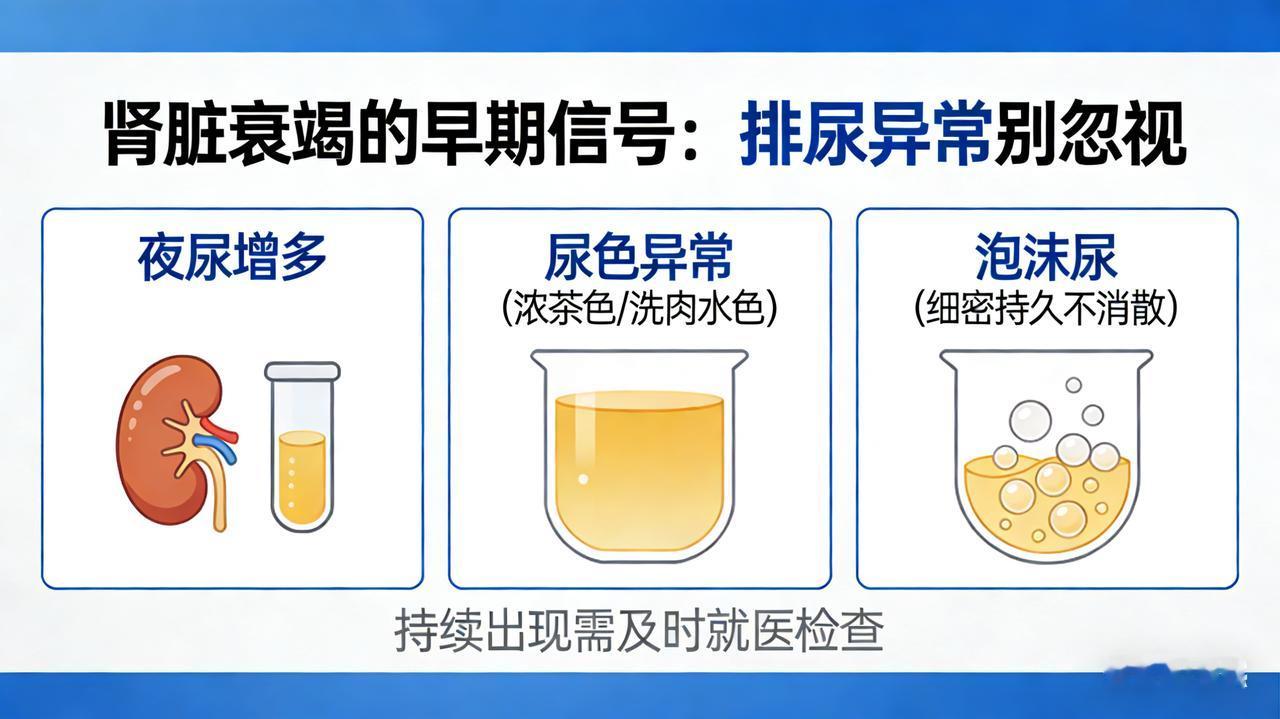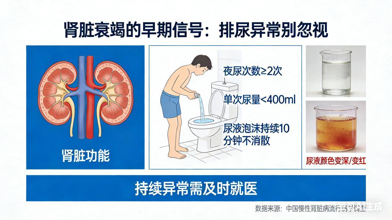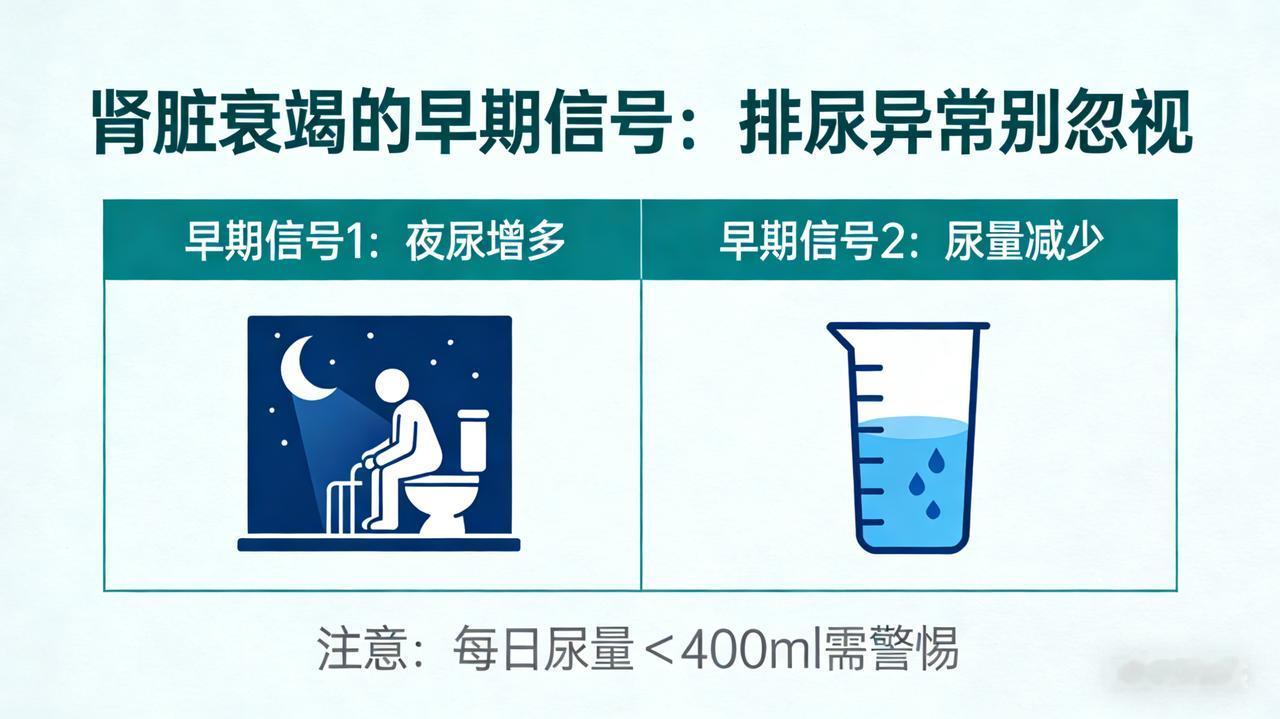 肾脏衰竭的早期信号:排尿异常别忽视 肾脏衰竭的“求救信号”,竟藏在一杯水里?别等透析才后悔! 肾脏是人体最能“忍”的器官,哪怕损失了50%的功能,它也可能一声不吭。临床上,90%的慢性肾病患者早期毫无察觉,等到身体垮掉时,往往已是尿毒症晚期。其实,肾脏崩溃的“第一张多米诺骨牌”,就藏在你喝水后的反应里。 信号一:尿液的“异常预警” 喝水后,健康的肾脏应迅速排出清澈淡黄的尿液。如果你发现尿量骤减(全天不足400ml)或夜尿频多(超过2次),这是肾小球滤过率“断崖式”下跌的铁证。更危险的是“啤酒沫”样泡沫尿——细密、层叠且久久不散,这意味着蛋白质正从破损的“滤网”中大量漏出,肾脏的防线已被攻破。 信号二:身体的“水肿悖论” 明明喝了水,却出现眼睑浮肿(尤其是早晨)或双腿按压凹陷的水肿,这是肾脏失去排水能力、水分淤积在皮下的“水中毒”前兆。更诡异的是“顽固性口渴”:喝了水却依然口干舌燥,这是肾脏浓缩尿液功能失效,身体陷入“喝水-流失-再口渴”的死亡循环。 信号三:全身的“毒素反应” 肾脏坏了,血压会莫名飙升(肾性高血压),且难以控制。同时,体内堆积的肌酐和尿素氮会化作“毒素”,让你感到极度疲乏、恶心厌食。这不是累了,是身体在代谢废物的海洋里“窒息”。 救命建议: 糖尿病、高血压患者或长期熬夜者,一旦出现上述症状,立刻去查“尿微量白蛋白”和“血肌酐”。记住:早期的一张化验单能保住你90%的肾功能,而透析只能替代10%。别让你的忽视,成为通往透析室的单程票!