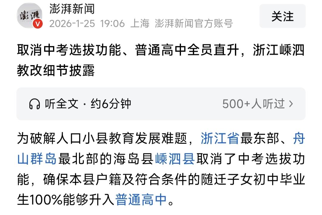 今天教育的最热点新闻,毫无疑问是浙江嵊泗县取消中考的选拔淘汰功能,所有初中生全员直升高中。这个消息一出来,天下父母欢欣鼓舞,纷纷点赞留言,杭州什么时候实行,天津什么时候实行,我们这里什么时候实行。 其实如果不是因为这一则教育新闻,相信全国很多人都不知道浙江省最东部的这个美丽的海岛县嵊泗县。他是浙江省舟山市下辖县,全市人口6万多人,总人口6万多人,那么,初中生能有多少人呢,应当不多。这是这根县能进行这项改革的一个基础。如果你的城市有几万考生,十几万初中考生,直升高中还需要漫长的等待。 对很多孩子和家庭来说,这终究是一件好事,可以减轻压力。不过也有一点,没了中考的压力,还得想办法让老师和学生都不要躺平,该努力还是要努力,不然到高中也是白费,毕竟最后还有高考的压力。教育