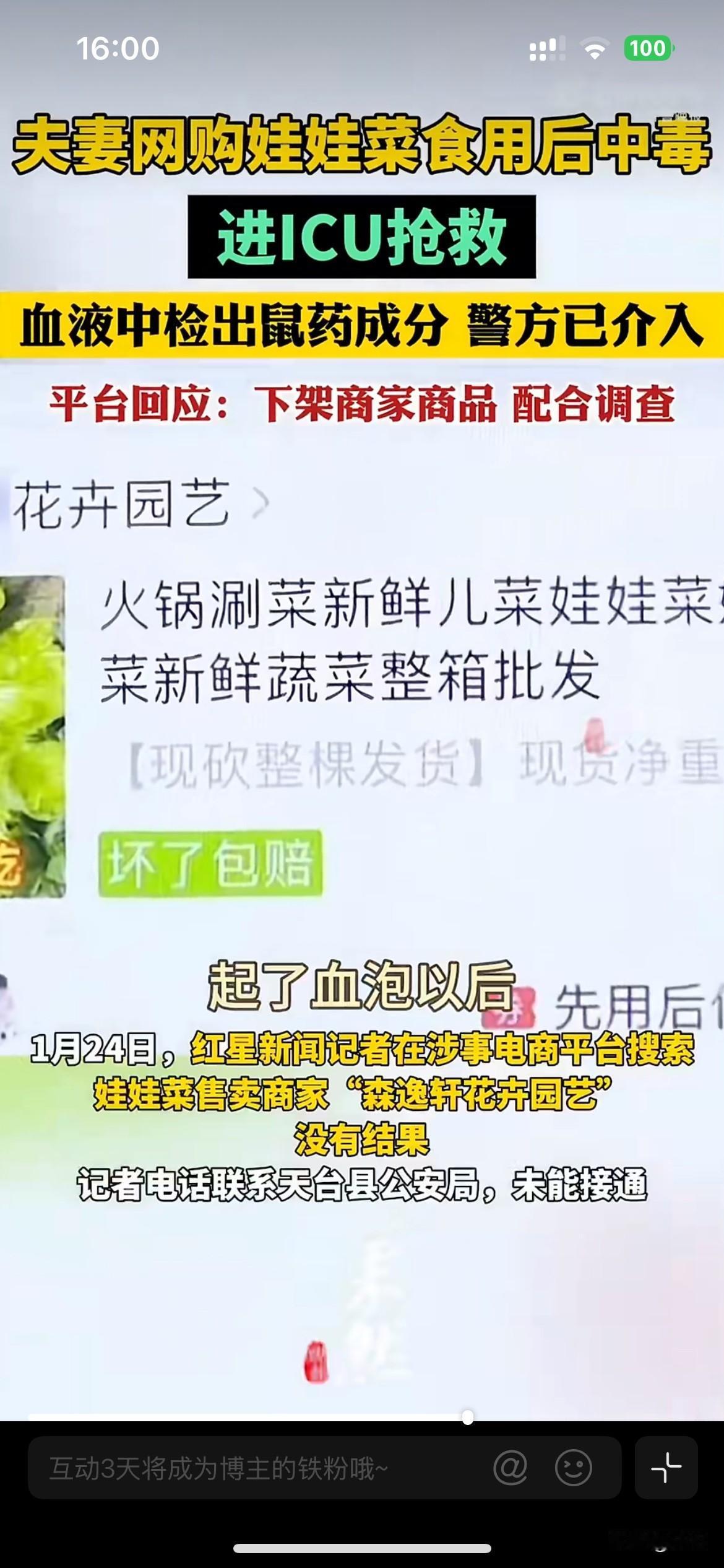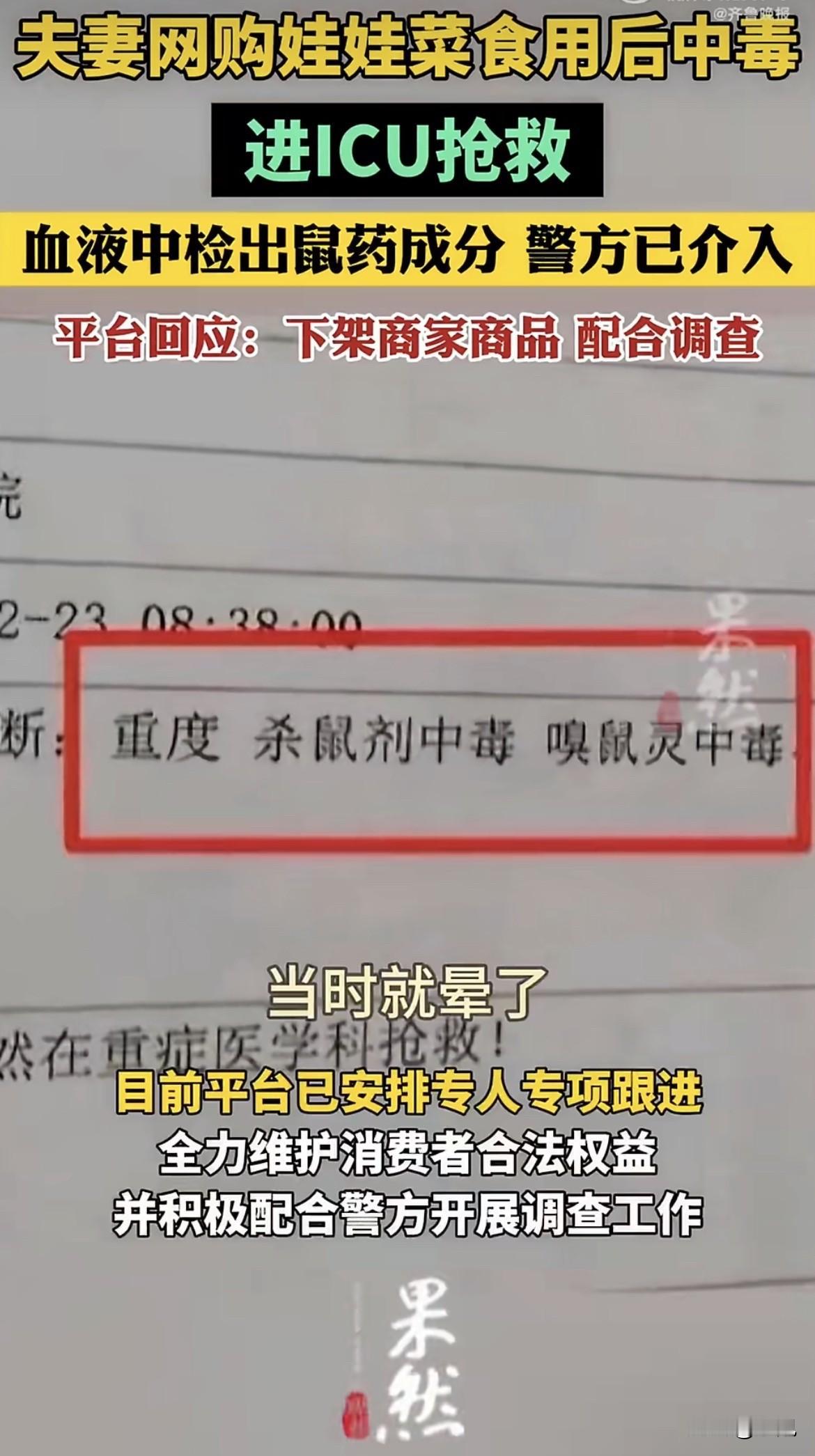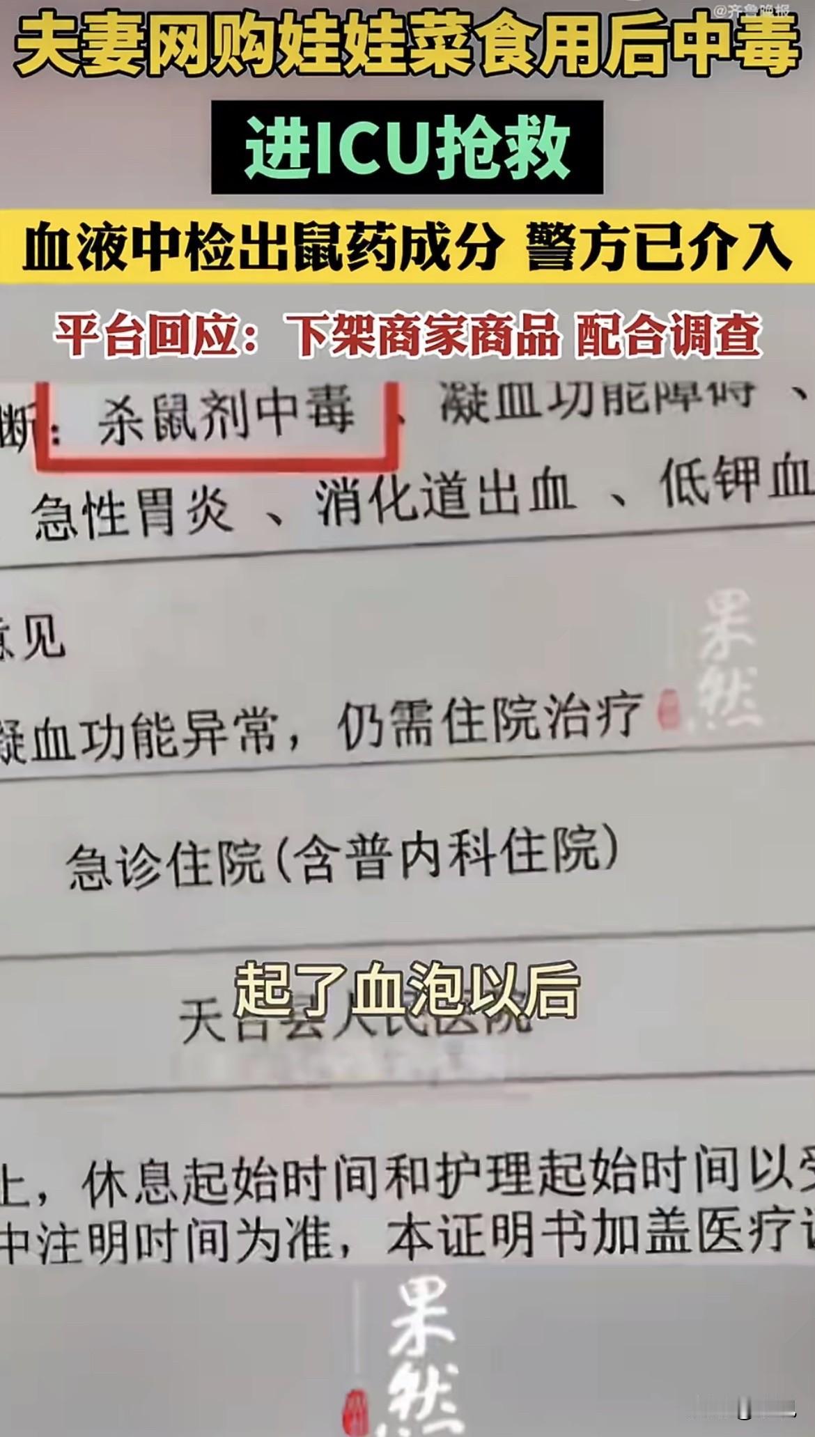 浙江台州,杨女士和丈夫吃了顿网购的娃娃菜,第二天开始流鼻血,止不住。他们被送进医院,诊断结果让人头皮发麻:杀鼠剂中毒。两口子都进了ICU,妻子抢救了一个多月才好转。 那袋娃娃菜,8斤重,花了17块钱。吃的时候没觉得异常,不舒服是后来才开始的。 警察来了,取了样。检测结果出来,剩下的娃娃菜里,确实有老鼠药。问题出在哪儿?不是菜地,不是农药。警方的调查指向一个谁都没想到的地方:包菜的旧报纸。 那些用来塞在包装里防撞的旧报纸,在回收储存时沾上了杀鼠剂。卖菜的商家为了省点成本,用了这些报纸,毒物就慢慢渗到了菜上。 杨女士去找网店客服。那边回复:不可能,我们的菜没问题。商家后来对媒体说:“我一年卖几千万件东西,你跟我讲蔬菜里面有老鼠药,那不是无理吗?” 但店铺很快就注销了。从出事到店铺消失,没过多久。 这种老鼠药叫溴鼠灵,是抗凝血类的。它不让你马上难受,偷偷破坏你血液的凝结能力。一两天后,身体就开始从各个地方“漏血”:牙龈、皮肤、内脏。等发现严重头晕、无力、呼吸困难时,可能是内出血已经很厉害了。 17块钱的菜,和ICU里一个多月的抢救,这两样东西放在一起,格外刺眼。那几张要命的旧报纸,省下的可能就几分几毛钱。 平台把店家的商品下架了,说会督促商家解决,配合调查。现在店没了,但跑得了和尚跑不了庙,平台提供了店主信息,警方在追责任。律师说了,商家这不仅是赔钱的事,可能已经涉嫌犯罪。卖东西的,省成本省到包装材料上,这心思动得可怕。 我们天天网购,图个省钱方便。但有些钱,真不能省。尤其是吃进嘴里的东西,从地头到餐桌,链条那么长,任何一个环节为省那一点成本出了纰漏,到消费者这里就是百分百的风险。包装材料,这种看不见的角落,成了最危险的漏洞。 这件事,你怎么看?你觉得在网购生鲜时,除了价格,我们最该留心什么?