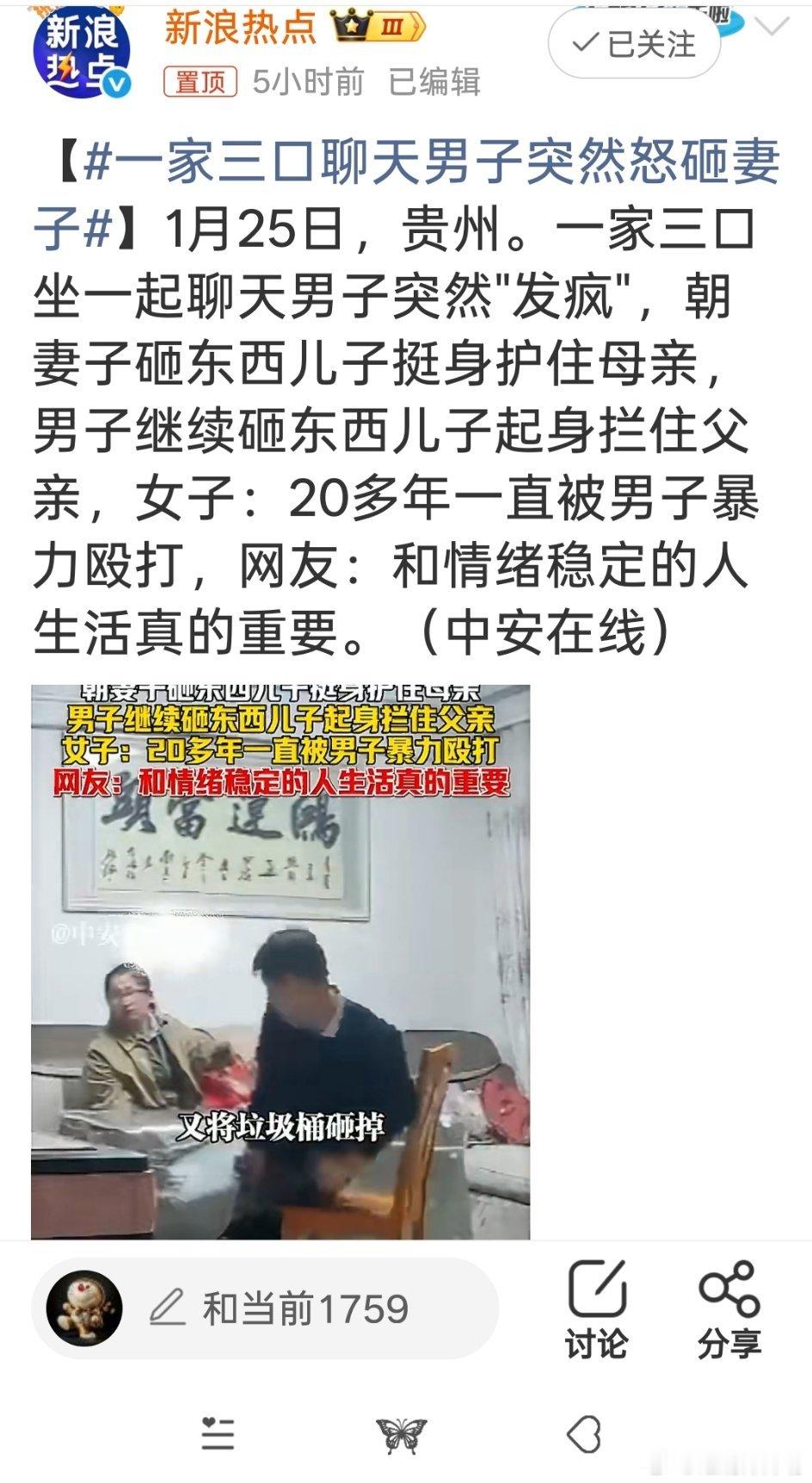 一家三口聊天男子突然怒砸妻子理解不了!!被家暴了二十多年,还能不离婚,还能这么坐下聊天……二十多年,娃都能自立了吧?还有啥放不下的啊?