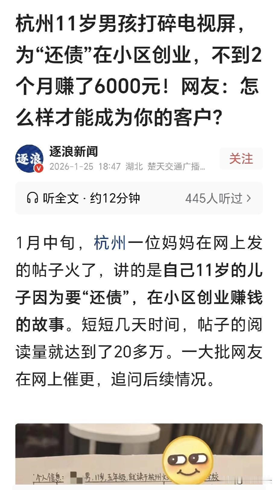 竟然被一个小孩哥震撼到了!浙江杭州,一11岁男孩把家里电视屏打破,换屏需要6000块钱,男孩决定创业还债,他让妈妈发布海报: 陪写作业1小时40元、一个半小时60元;田径1小时30 元,一个半小时 50 元……他还注明:本人因打碎家中电视屏,一人做事一人当,所以出来筹钱修电视。以上是我的特长,望叔叔阿姨给我机会,谁知海报发出,得到了叔叔阿姨的热烈欢迎,两个月时间,就换了新的屏幕,网友发了私信:怎样才能成你的客户? 尧哥现在才上初一,妈妈说到他五年级时,曾经发生过一件趣事。 尧哥那时还小,一不小心打碎了自己家新的液晶电视屏。 尧哥愣了片刻,他没有慌张,立刻心里就有了主意。 他告诉母亲,一人做事一人当,他做了错事,应该为此承担责任。 他做出一个勇敢的决定,他要创业,决定自己给家里更换新的屏幕。 他做了个海报,让妈妈在小区群里发布。 海报上写着: 语文、数学、田径、足球、钢琴都是我的擅长爱好。 其中明细: 陪写作业一小时 40 元、一个半小时 60 元;田径 1 小时 30 元,一个半小时 50 元…… 足球1小时30元,一个半小时45元;钢琴45分钟30元,一小时45元。 之后他又注明: 本人因打碎家中电视屏,一人做事一人当,所以出来筹钱修电视。 以上是我的特长,相应的课程,以小学生面对小学生这种新方式进行一系列培优。 望小区内各位叔叔阿姨理解我,给我机会。 妈妈本以为儿子这样,本身就是培养他的责任和胆量,至于能不能被家长们接受,那就是另外的事情。 可是万万没有想到,尧哥的举动受到了热烈的欢迎,家长们热烈支持,纷纷和他签了约定。 从这天起,尧哥就开始了创业之举,他忙忙碌碌,陪着孩子们写着作业。 他不但陪写作业,还帮助孩子举一反三,孩子们在学习期间,当真是获得了巨大的帮助。 家长们对他更加的喜欢,就连他的周末都被排的满满当当。 母亲成了他的经纪人,把他的课程时间进行了合理的安排。 尧哥的坚持和努力让人动容,他没有喊累,而是快乐地奔波在小区客户家里。 他干着干着,又萌生出一个更大胆的想法,他要开办一个小区足球俱乐部,这个想法得到了妈妈的支持。 在妈妈的帮助下,海报很快热乎乎出炉,可场地和设备成了新的问题。 妈妈陪他找到一个废弃足球场,还借了100元钱给他购买了运动设备。 足球俱乐部顺利开业,现场涌来 20 多个孩子,尧哥立刻把学员们进行了分组。 他教孩子怎样热身,练习基本功训练,他组织孩子们游戏实战,原本15元一堂课,足足延长到了一个半小时。 他的专业和负责赢得了家长们的点赞,学员也随之越来越多。 到了后来,他还引入了赞助商,招募助教,定制教练服,让俱乐部越来越正规。 尧哥经过不懈的努力,仅仅两个月的时间就筹到了6000块钱。 这是他的劳动所得,很快就给家里更换了新的电视屏幕,消息传开,就有更多的家长找来。 尧哥已经还清了债务,他靠自己的聪明头脑创造了奇迹。 他也没有恋战,他还要开始自己的学业。 尧哥的成绩,源于他自身的优秀,他的文化课成绩排年级前10名内。 他拿到过区小学生运动会800米的冠军,还拿到过市长杯足球赛的季军。 他的奖牌不计其数,他还是少年足球队的主力队员。 他学习过钢琴,陪练4级以下没有任何的问题。 有人感叹,人和人真的不一样的,这小子长大了是一个全能人! 真佩服他的父母平时的谆谆教导,也感叹小孩哥的绝顶聪明! 尧哥的故事给我们很多启示,在孩子的成长过程中,我们一定要学会放手。 要让他们勇敢的去尝试,去犯错,去承担责任。 只有这样,孩子才能在面对困难时勇敢前行,在解决问题中不断成长。 作为家长,也要做好引导,在孩子需要时给予最大的支持,希望每个孩子都能像尧哥一样,在成长的道路上绽放光彩。