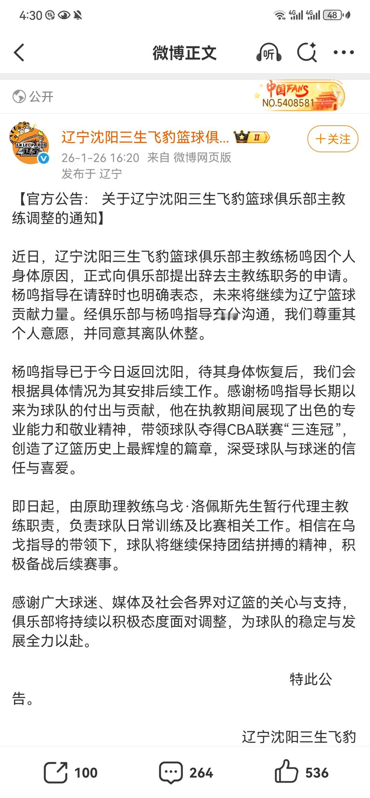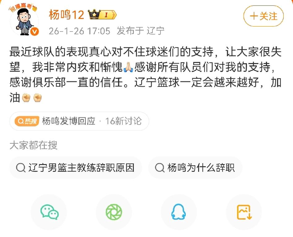 虽然辽宁男篮官方官宣了杨鸣指导因为身体原因暂时辞去主教练的职务,但是球迷都明白根本不是身体原因! 因为杨指导根本就没有休息修养身体,而是去当NBA解说去了,很大原因是外援不到位四连败更衣室按不住了。 等乌戈把球队带到正轨杨鸣指导还是会回来的,他不可能离开辽宁队的,别看是三连冠教练但是没有进过国家队,球员时期没有好的成绩很难去其他队带人的。