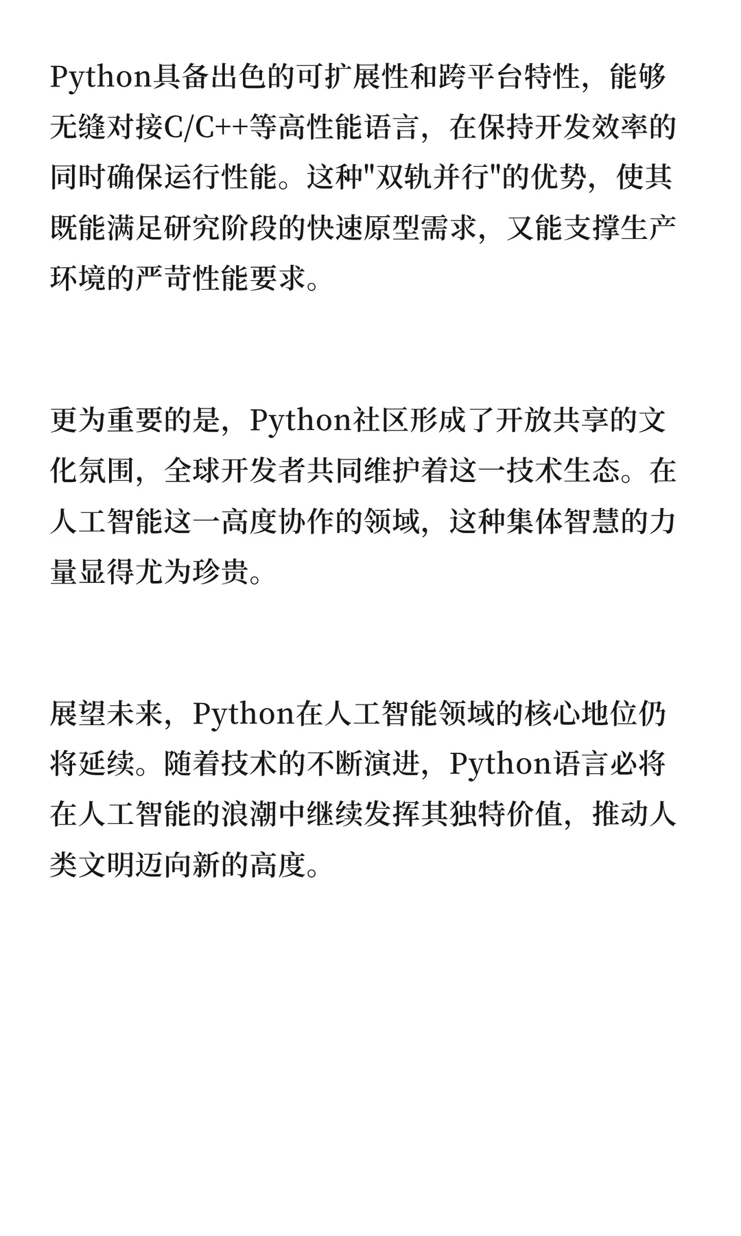 展望未来,Python在人工智能领域的核心地位仍将延续。随着技术的不断演进,Python语言必将在人工智能的浪潮中继续发挥其独特价值,推动人类文明迈向新的高度。