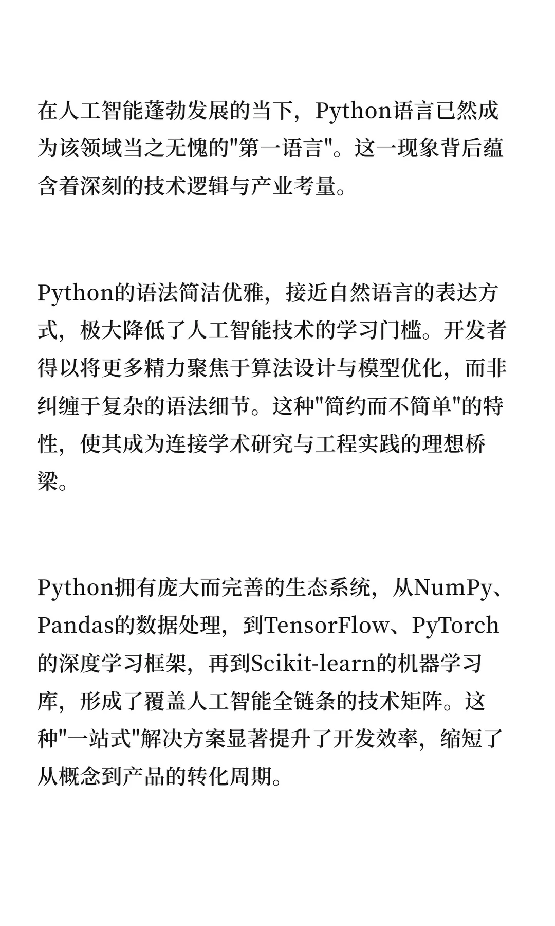 Python拥有庞大而完善的生态系统,从NumPy、Pandas的数据处理,到TensorFlow、PyTorch的深度学习框架,再到Scikit-learn的机器学习库,形成了覆盖人工智能全链条的技术矩阵。这种"一站式"解决方案显著提升了开发效率,缩短了从概念到产品的转化周期。