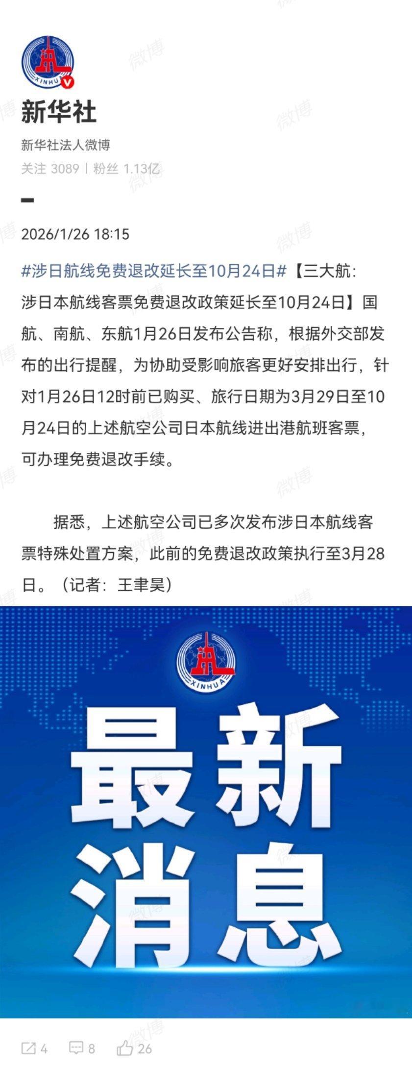 提醒中国公民近期避免前往日本,三大航涉日本航班免费退改延长至10月24号。➤要听