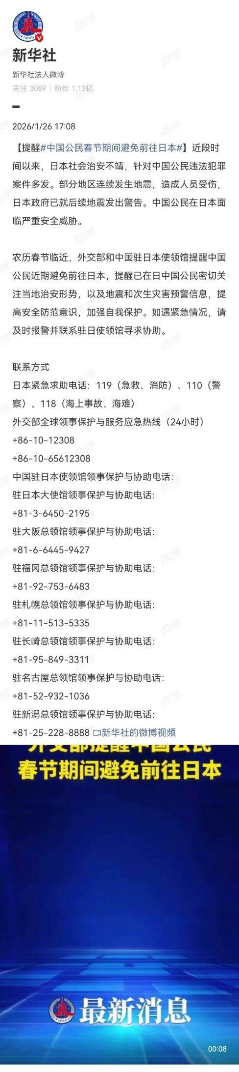 提醒中国公民近期避免前往日本,三大航涉日本航班免费退改延长至10月24号。➤要听劝。热点观点中国公民春节期间避免前往日本