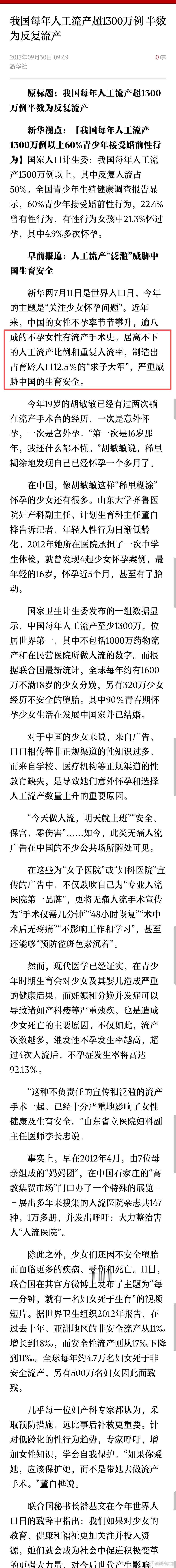 “根据国家统计局数据,官方统计,2022年公立医院人工流产数量为976万,如果加上私人诊所及私立医院等,我国每年人流数量超过1300万,其中过半是25岁以下年轻女性。”上述说法引用的相关数据的确存在,但在细节处却是错位的。根据网友考证,官方在2022年以后,就没有再公开过人工流产的相关数据,而已知的最新数据,也停留在2020年。据其查证,2020年,中国人工流产数量为896万;往前一年,也就是2019年,人工流产数量为976.2万。至于该文案后续提及的1300万,这个数据其实来自国家人口计生委科学技术研究所。据中青报报道,2013年,该所发布的相关数据显示,我国每年人工流产多达1300万人次,这还不包括药物流产和在未注册私人诊所做的人工流产数字。该所发布的数据还显示,我国每年人工流产总数中,25岁以下的女性约占一半以上,大学生甚至成为人工流产的“主力军”。除了低龄流产外,半年内重复流产+多次人工流产的问题,也相当严峻。广州市妇女儿童医疗中心发布的统计数据显示,2013年1-7月,该院病人的重复人工流产(两次及以上人工流产)率为46.62%,短短半年时间内再次人工流产率近2%。另有数据显示,流产妇女中,重复流产率为55.9%,其中3次以上频繁流产比例为13.5%,45%重复流产的时间间隔为0.5-1.5年。惊人的流产数据,甚至让新华社在报道中惊呼:居高不下的人工流产比例和重复人流率,制造出占育龄人口12.5%的“求子大军”,严重威胁中国的生育安全。