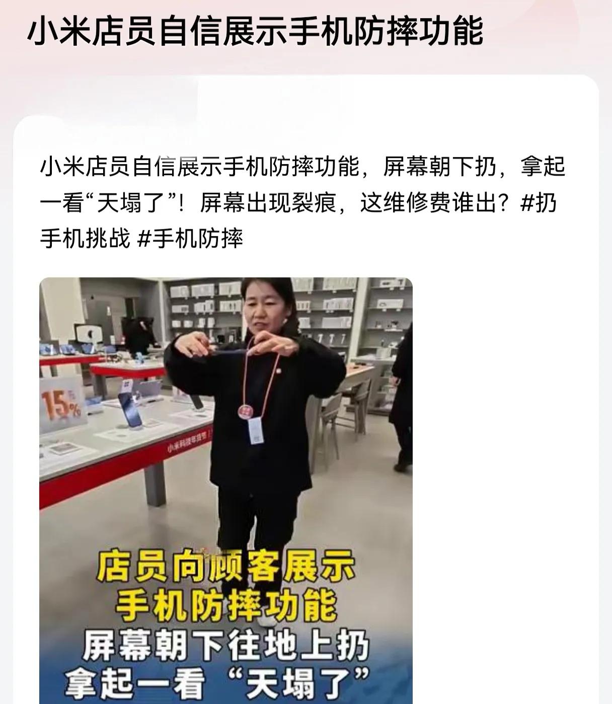 小米手机又翻车了!小米店员自信摔自家手机,本来要展示一下防摔功能,结果捡起手机一看,直接惊呼“哎呦喂!”屏已经裂开,这让消费者情何以堪? 更有网友出言调侃,维修费谁出? 没实力还是低调一点,你宣传你家手机有防摔功能,谁买了也不会真摔去验证,可你自己展示搞翻车,那还让消费者如何信任你这功能?虚假宣传呀!这可不是维修手机的事了,所有的包装都必须更换,把防摔去掉![捂脸][捂脸]