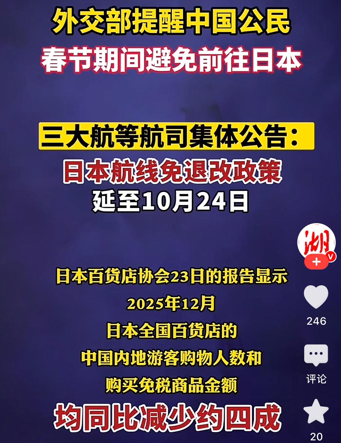 26日,中国外交部发出警示:春节期间避免前往日本,因为存在严重的安全威胁!据悉,日本除了针对大陆游客的暴力行为多发,还有很大可能出现连续地震。 春节本是阖家团圆、欢乐出游的美好时刻,然而日本目前这样不稳定的安全状况。为了游客的生命健康和安全,中国外交部发出的这一警示是及时且必要的。如果还有不听劝的非要去,出了问题可不要怪国家!