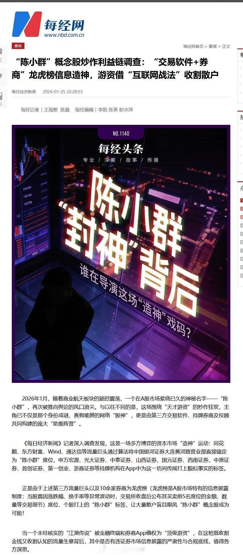 媒体:"陈小群”概念股炒作利益链调查:“交易软件+券商”龙虎榜信息造神,游资借“互联网战法”收割散户…