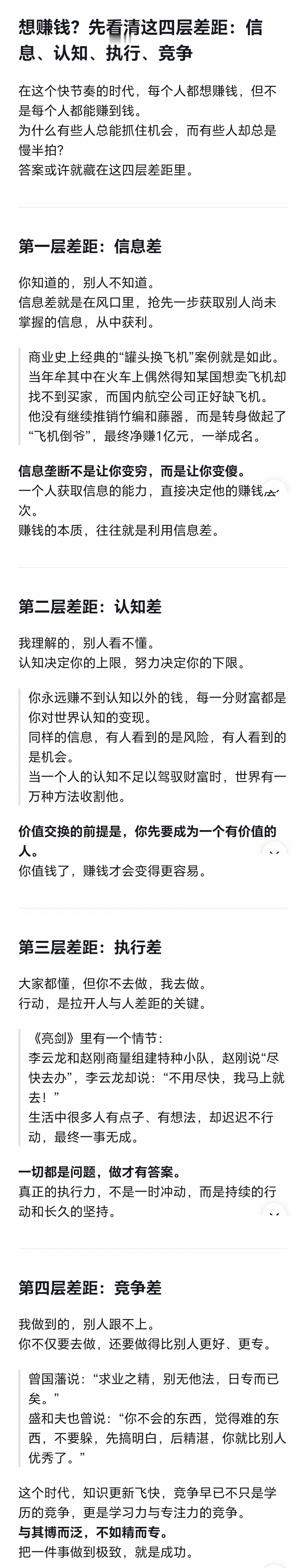 拉开差距的四层维度1. 信息差:抢占先机,快人一步。2. 认知差:深度洞察,看懂趋势。3. 执行差:马上行动,持续落地。4. 竞争差:做到极致,构建壁垒。天道酬勤,也酬专、酬精、酬信。在这个快速迭代的时代,不断学习、持续行动、深耕专业,才是你真正的核心竞争力。从现在起,别只想,去做;别只做,做精。你的财富,终将与你的认知和行动相匹配。
