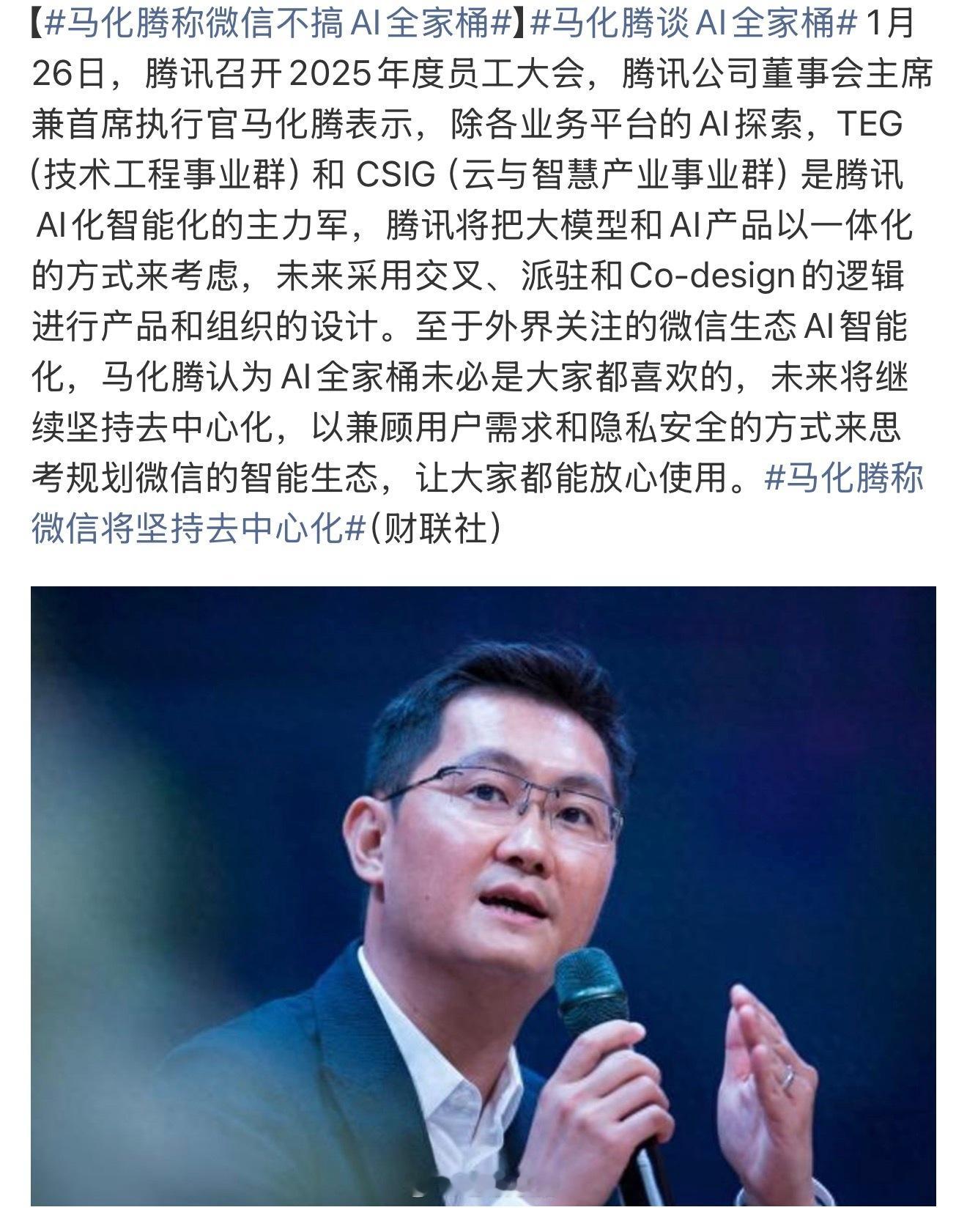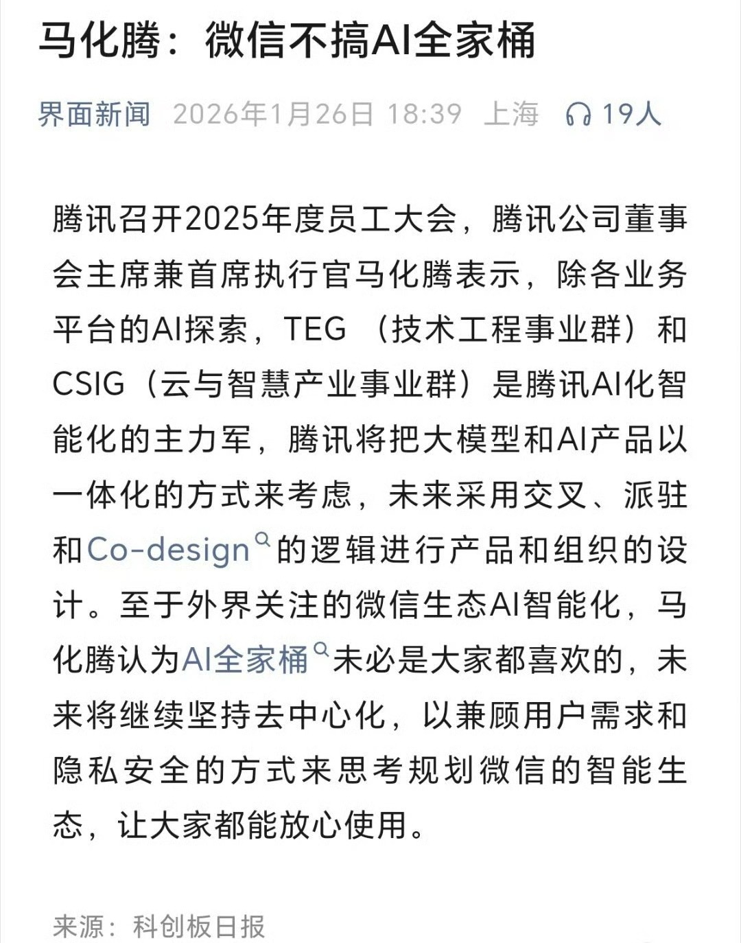 马化腾称微信不搞AI全家桶个人觉得这样才是对的,把所有东西都介入AI,反而没了意思。AI存在的意义是让人与人之间的连接更轻松,过去的AI社交产品,都在搞虚拟陪伴,结果用户玩三天就腻了,效果反而适得其反。不造新关系,只优化老关系。这也不是与AI进行切割,而是以微信为核心入口,整合自家微信生态,相比其他家可能会更加开放。