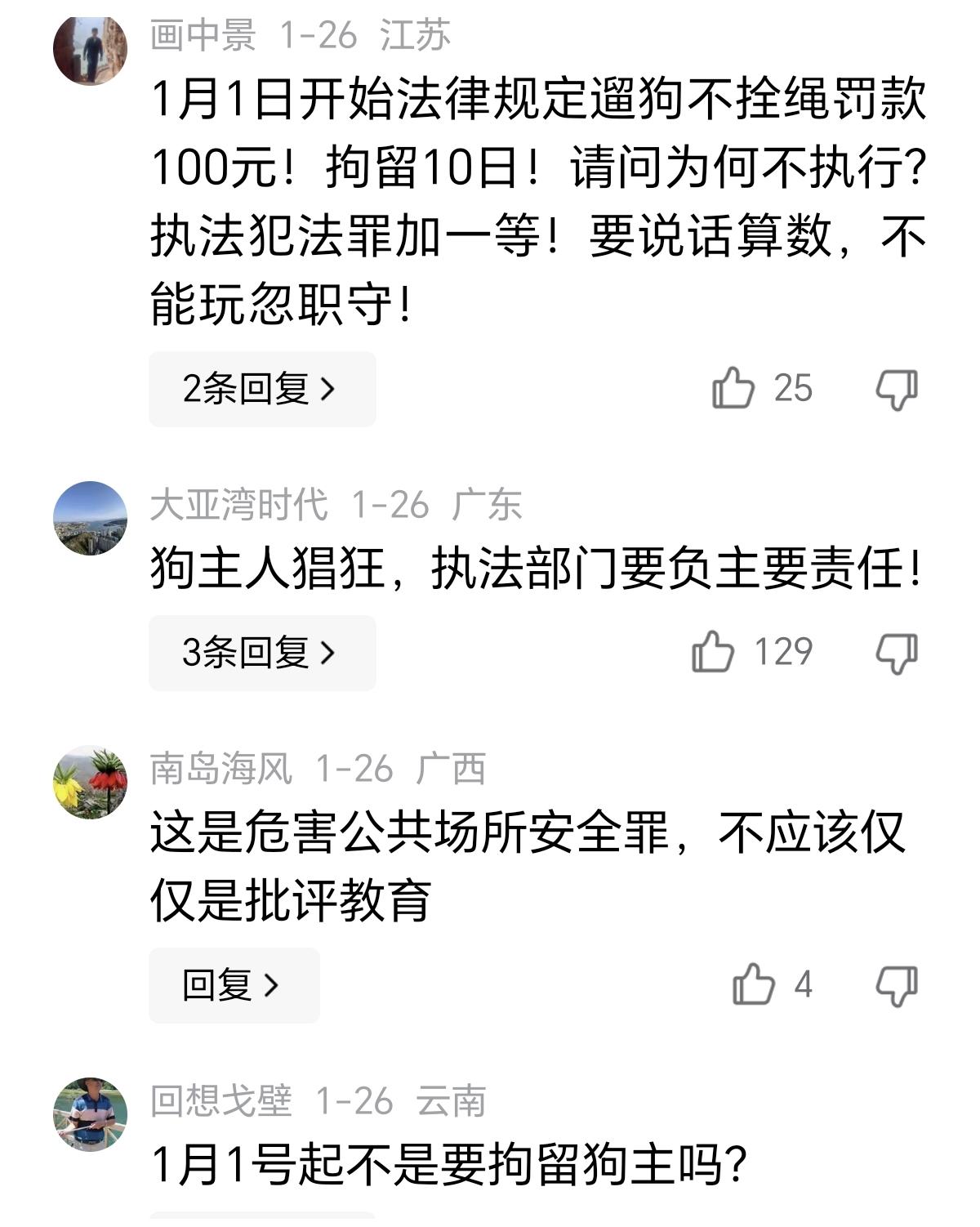 批评教育能管用吗?一男子跑步被没拴绳的大狗追咬,而狗的主人还态度蛮横。报警后,工作人员表示,已经对狗的主人批评教育了。 如果批评教育有用,还会常有这样的事发生吗? 如果批评教育就可以了,新规还有发挥作用的机会吗? 按照今年1月份开始实施的新规,遛狗不拴绳扰民的,可以对狗的主人实施1000元以下罚款,甚至行拘。 据百姓关注报道,1月25日,四川宜宾,王先生在街边的路上跑步,突然一条没拴绳的大狗窜出来,追着他就咬。 王先生急忙躲闪,幸亏没被狗咬到。 好不容易找到了狗的主人,可对方态度蛮横(此处省去500字),于是王先生就报警了。 明明是把狗放出去在街上乱跑扰民,狗的主人难道不应该按照新规被处罚吗? 难道非要等狗把人咬伤了才应该罚款或拘留? 从轻处罚就是纵容。 新规落地到位需要执行层面的配合和努力才能实现。