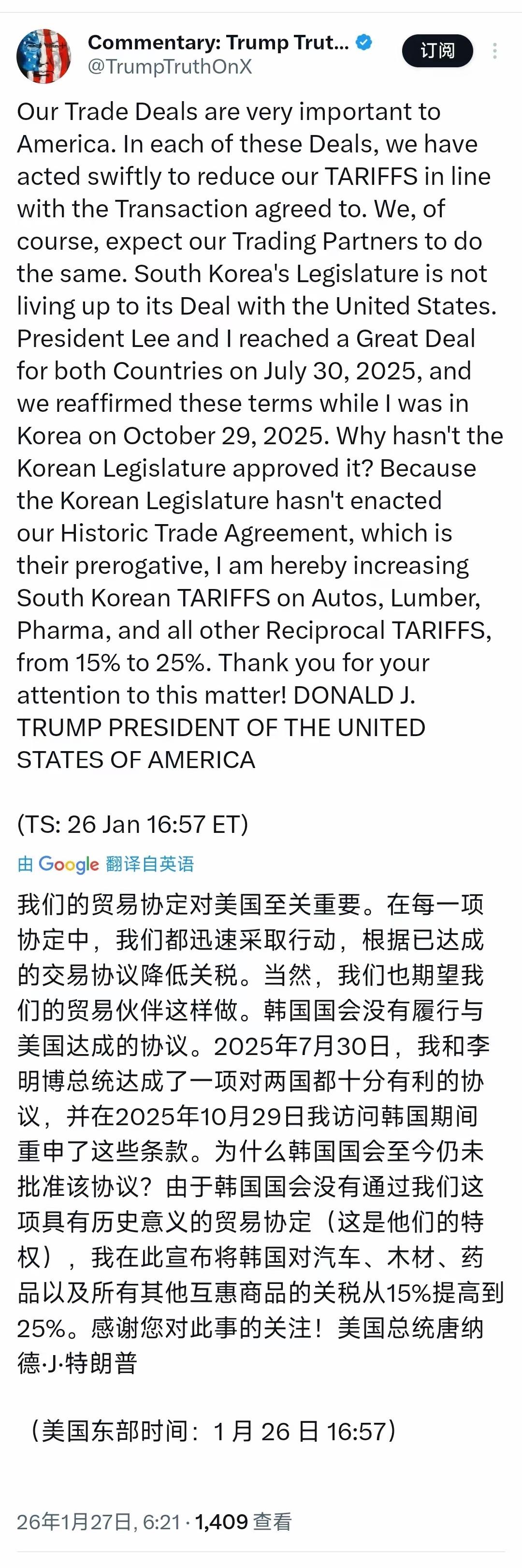 突发,26日特朗普愤怒发文,这次把矛头直指韩国。原来是韩国没有履行与他达成的协议。因韩国会至今仍未批准该协议。所以特朗普已宣布将韩国对汽车,木材,药品以及所有其他互惠商品的关税从15%提高到25%。 特朗普不愧有“万税爷”的称号!只要不开心,就挥舞起关税大棒一顿挥舞。但其恐怕不知道,关税武器也会“边际效应递减”,效果只会越来越差! 更重要的是,如此频繁地动用关税武器,还会让其他国家对美国产生信任危机。各国会担忧下一个被“制裁”的会不会就是自己,从而在与美国进行贸易合作时更加谨慎,甚至寻求与其他国家加强合作,减少对美国市场的依赖,到头来受损最大的还是美国自身。特朗普注定会是美国的“掘墓人”!
