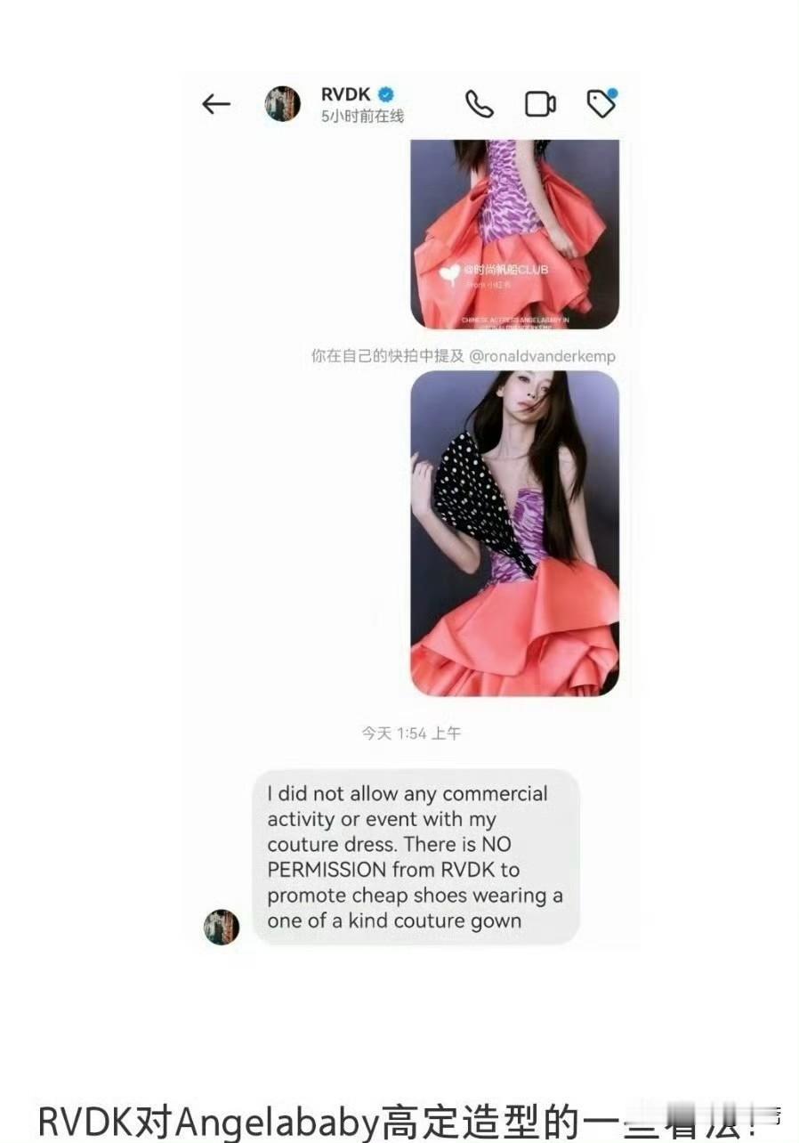 Angelababy作为红蜻蜓代言人,身穿RVDK 2024秋冬高定紫色礼服亮相品牌直播间,推广售价约500元的国产运动鞋,因高定与平价鞋混搭被批风格割裂。 设计师通过私信回应网友,称品牌"从未授权高定用于商业直播",尤其反对搭配"廉价鞋子"(cheap shoes),认为此举违反高定调性。 看完视频,这几块布拼凑的高定衣服也没啥特别,黑白点、紫白方块、带尾巴粉泡泡裙,配色反而让人感觉廉价的一匹吧!配上红蜻蜓的红色运动鞋,确实皱眉头啊。 Angelababy在那里配合做各种娇俏可爱造型的时候,有点稀碎啊!