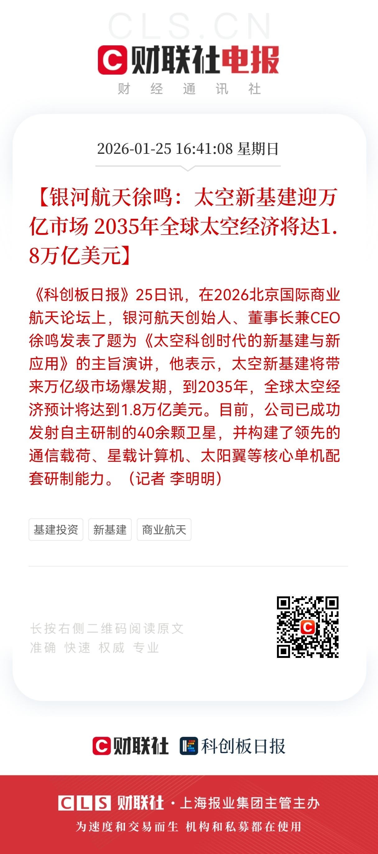 重磅利好! 商业航天再迎重大利好! 太空新基建迎万亿市场, 银河航天锚定核心单机,商业航天产业链再提速 好家伙,商业航天这热度,真是一波接一波。前脚还在说民营火箭发射,后脚“太空新基建”和“万亿市场”这词儿就砸过来了,听着就让人心跳加速。这不光是放卫星那么简单了,这是要在天上搭台子、建网络,搞一套全新的基础设施。 “太空新基建”这说法挺形象。咱们在地上搞5G基站、数据中心,现在要把这套思路搬到天上去了。想象一下,以后天上飘着的不再是零星的几颗大卫星,而是由成千上万颗小卫星组成的巨型网络,像一张大网罩着地球,提供全球无缝的通信、导航、遥感服务。这市场能不大吗?涉及制造、发射、运营、数据应用一整条链,说万亿真不是吹牛。 银河航天这次“锚定核心单机”,路子走得挺聪明。啥意思?就是不去追求一开始就造整颗卫星或者整发火箭,而是先集中火力,攻下产业链里最关键、技术门槛最高的那些核心零部件和设备。比如高性能的卫星载荷、先进的推进系统、可靠的星上计算机这些。把这些“心脏”和“大脑”掌握在自己手里,就等于卡住了产业链的脖子,以后不管是自己造整星,还是给别人供货,都有绝对的话语权。这比一上来就贪大求全、什么都想自己干,要踏实得多,也更容易出成果。 商业航天产业链提速,这是必然的。国家政策支持,市场需求摆在那儿,资本也眼巴巴看着。但越是这样,越不能光顾着喊口号、炒概念。真金白银投进去,最终要看能不能拿出可靠、便宜、好用的产品和服务。把卫星成本打下来,把发射价格打下来,把数据费用打下来,让更多行业用得起、用得好,这才是商业航天真正的“利好”落地。这个过程肯定不容易,充满了技术挑战和商业冒险,但方向已经看得越来越清楚了。谁能在核心技术上取得突破,谁能把成本和可靠性做到极致,谁就能在未来的“太空经济”里分到最大块的蛋糕。 各位读者你们怎么看?欢迎在评论区讨论。中国商业航天 航天发展市值 商业航天低价股 商业与航天 航天产业 航天经济