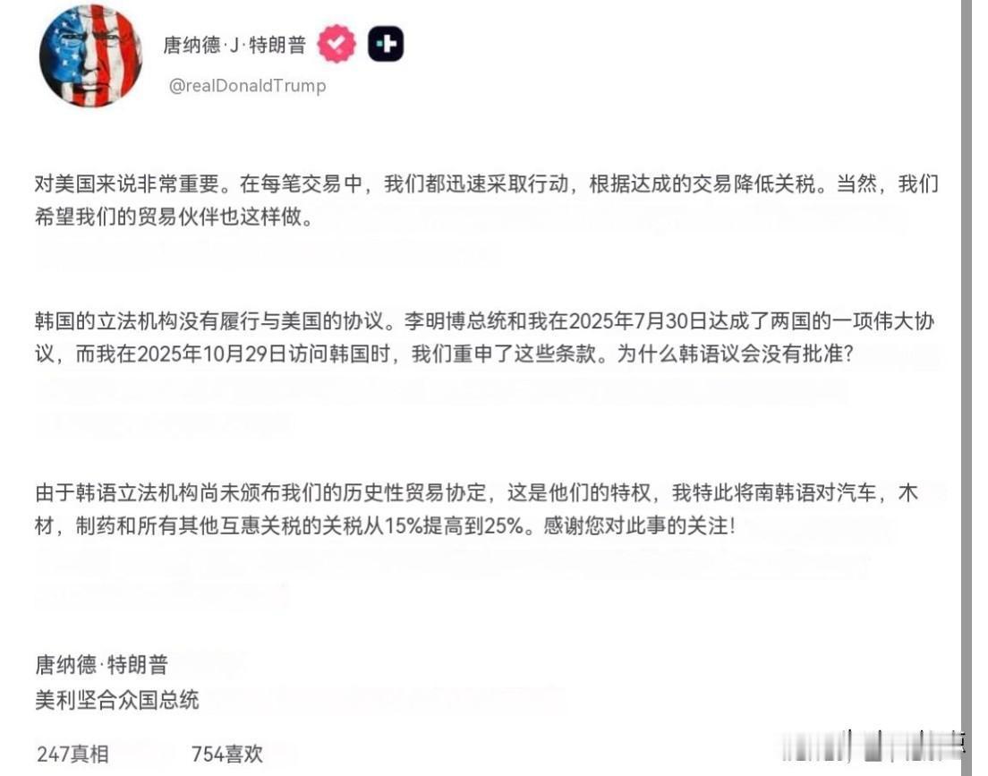 🔻由于韩国还没有批准和美国达成的商贸协定,美国将对韩国商品征收的关税由15%提高到25%。这些商品涵盖汽车、木材、制药和其它所有互惠关税。 🔻特朗普说:“去年7月份就达成了协议,我10月份访问韩国时大家又重申了一遍,都2026年了还不批准?” 🔻好家伙!李在明的“王冠”白送了,晚点也不行?