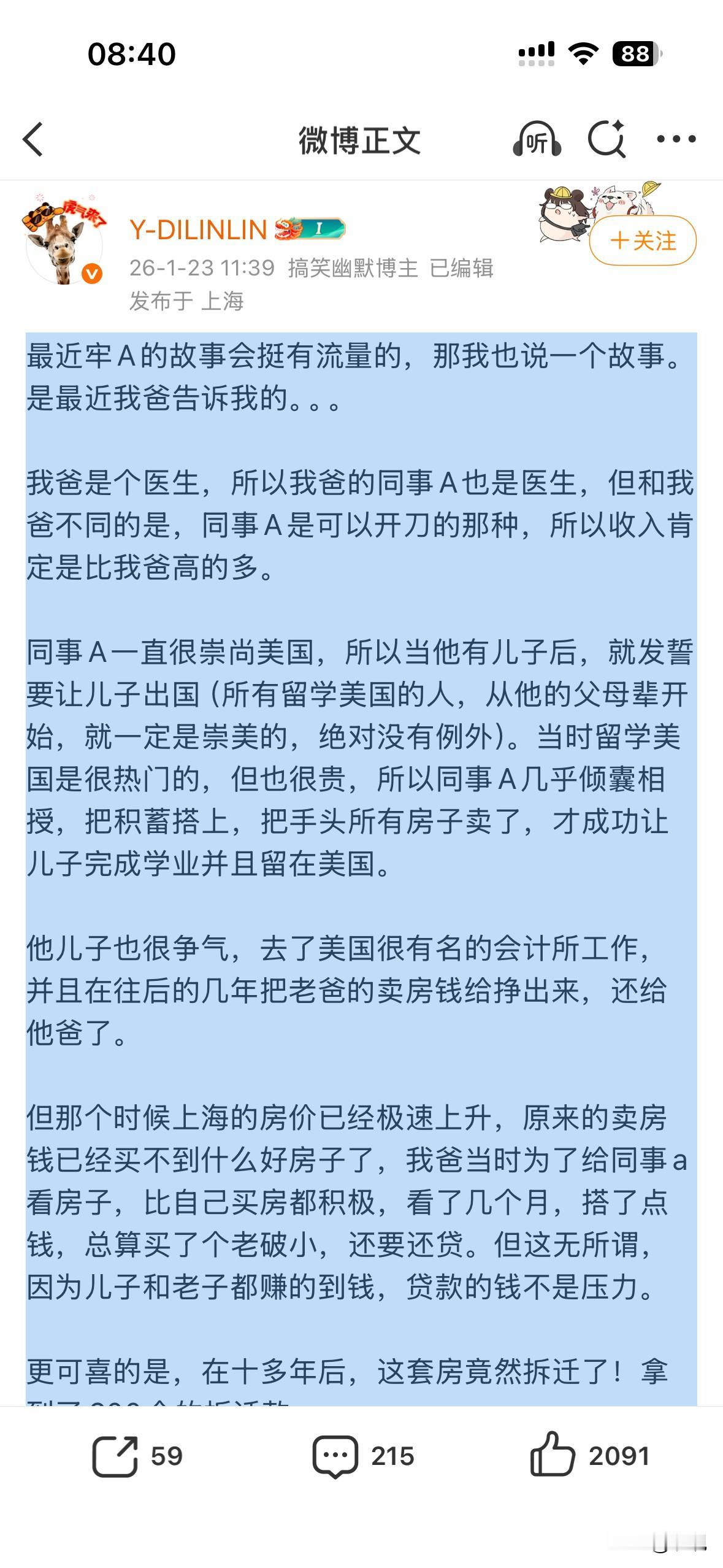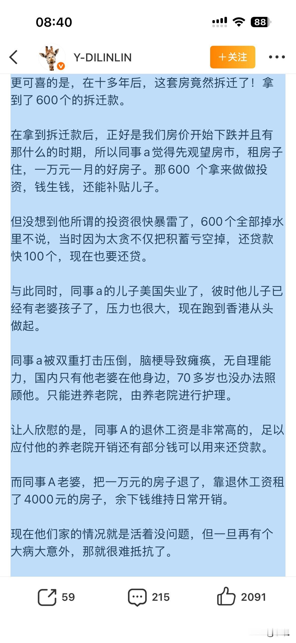 这个故事和牢A的关联也不大,无非就是一个魔怔向往美国的上海人,卖房资助儿子去美国留学,儿子也成功留美赚到钱帮爸爸买回房子,这房子后面又喜提拆迁,获得600万拆迁款。如果故事到这里,就是一个happy ending。 然而600万被这个上海人投到了不靠谱的地方,暴雷了拿不回来了!还贷款了100多万。这个时候儿子在美国失业,带老婆孩子去了香港,从头做起。这位老人受到打击脑梗瘫痪,只能到养老院,好消息是退休金还比较高,可以覆盖支出…… 这个故事只能说明人性的贪婪和无明也是斩杀线的一个触碰机关。 毕竟600万哪怕买最低档的理财产品,一年基本保底也有10多万左右的收益,足够交完房租还有剩的。 只能说故事的开头,没那么多妄念和执着,一家人在上海生活不香吗? 万法唯识,你的人生便是你的念头。