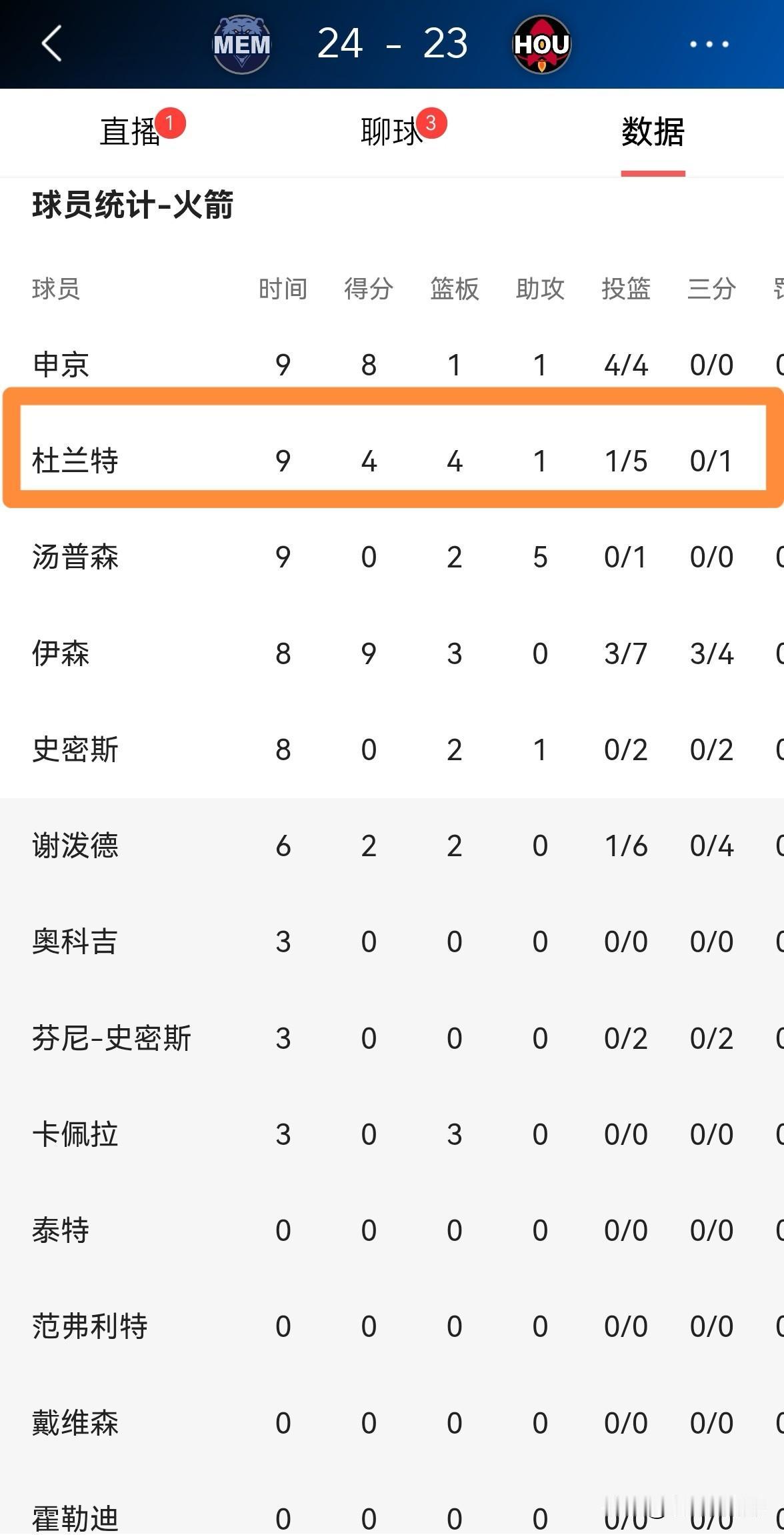 火箭超级球星杜兰特真是大失水准!在今天火箭主场迎战灰熊的比赛中,目前双方的首节比赛已经结束,火箭以23:24落后对手1分。让人感到非常意外的是,在第一节比赛中,杜兰特在进攻端的表现大失水准,他在首发出战的9分钟里,投篮5中1,其中三分球1中0、罚球3中2非常低效的得到4分。 对于杜兰特来说,如此低效的进攻效率是非常罕见的,希望他能够及时的调整好自己的状态,不然的话火箭非常有可能输给灰熊,尽管灰熊当家球星莫兰特因伤缺阵。