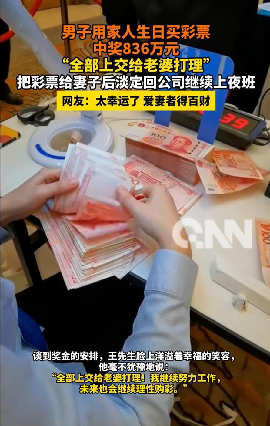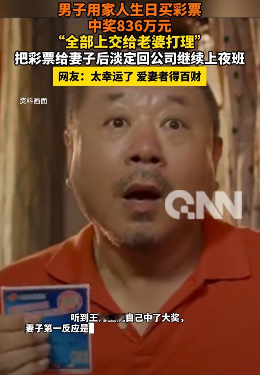 这老婆嫁对人了!广东佛山,一男子用家人的生日买了注彩票,结果晚上兑奖时,发现竟然中了836万元大奖,老婆确认中奖后激动地语无伦次,反倒是男子相当淡定,把彩票递给妻子后,自己去值夜班了 王先生也算是一位老彩民,平时路过彩票店时总会打上两注,不过他并不是机选,而是用家人的生日来买号,他感觉这样会更有意义,也可能带来运气 当天开奖后,他发现中了大奖,第一件事就是告诉妻子中奖了,可期间看他这么淡定,还说了句“假的吧”,而当王先生把彩票和开奖号码一起拿出来确认后,妻子再也坐不住了,两人也是激情庆祝了一番 可很快王先生就冷静了下来,把彩票交给妻子后,自己去上班了,而谈到中奖后的规划,他表示会让妻子打理,他还会继续照常上班 一张用生日组成的彩票,中奖概率其实和别的号码没什么不同,但里面藏着的东西不一样。它不只是一串数字,还是一个家的温度,是丈夫日常里的一份惦记。这种惦记很朴素,不一定是为了中奖,更像是一种习惯,把重要的人,写进生活每一处可能的地方 网上常说,嫁没嫁对人,生个病吵次架就知道。其实不用等那么激烈的时候,看一件大事落在眼前,两个人怎么反应,就够了。是互相怨着算计,还是自然地把对方放进未来里;是一惊一乍狂喜失态,还是知道日子终究要落在实处,那种默契装不出来