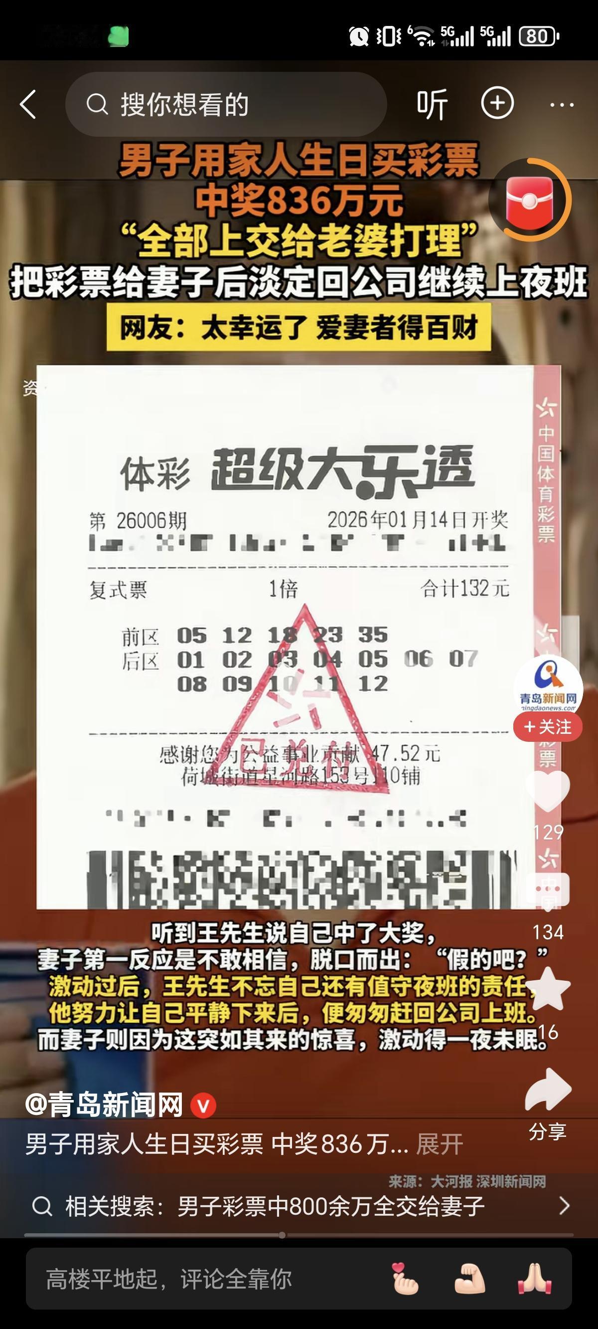 2026年1月27日,佛山王先生用家人生日数字组合买彩,中得836万大奖。他随后却淡定回公司上班,并宣布奖金全交妻子打理,自己继续工作。 这“反常”反应蕴含理性智慧:用“生日数字”是赋予随机以情感意义的心理仪式;中奖后立刻返岗,是以熟悉日常对抗骤变、保持清醒的“心理锚定”术;奖金交予妻子,是基于信任的家庭资产专业化风险管理;而“继续工作”的宣言,则是守住个人价值与社会连接,避免陷入“财富诅咒”的长远基石。 王先生的“平常心”,完成了一次完美的财富观示范:真正的幸运,是巨额奖金未曾改变的生活初心与家庭责任。他守护的,是比836万更珍贵的生活本身。生日数字能量