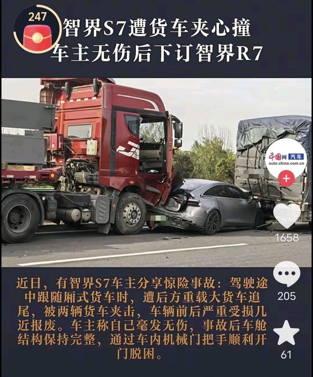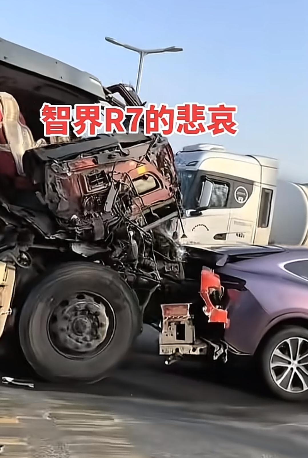 我的天呐,智界R7和智界S7,被半挂车夹饼干一样,夹在中间,但是智界S7和智界R7都扛住了。 通过这两场交通事故,我们看得出被动安全有多重要,如果说这两台车不是用料10足,凭什么能扛得过半挂车的夹击? 华为进入了汽车行业后,证明以前的车的被动安全。有多差劲,所有鸿蒙智行的车,主动安全是其它车没有的,被动安全也不如鸿蒙智行的车,电池安全也不如鸿蒙智行的车。 最后大家开车一定注意安全。