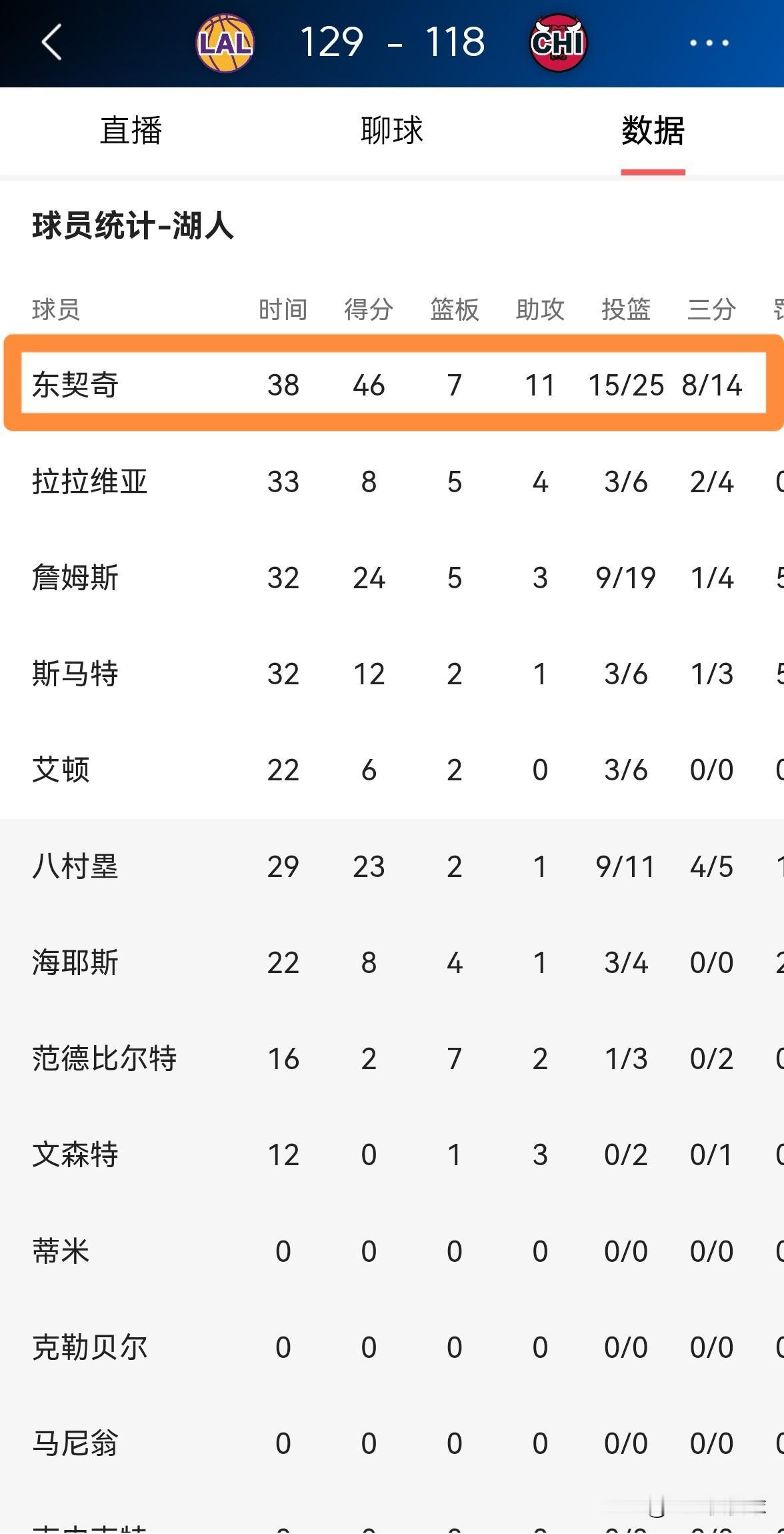 我真是被湖人当家球星东契奇打服了!在今天湖人在客场以129:118力克公牛中,东契奇展现出了无与伦比的得分和助攻能力。 本场比赛东契奇首发出战38分钟,投篮25中15,其中三分球14中8、罚球12中8狂轰46分,外加7篮板11助攻,他的场上正负值为+6。 当我亲眼目睹了东契奇在本场比赛中的巨星表现后,我对他真是佩服的五体投地。