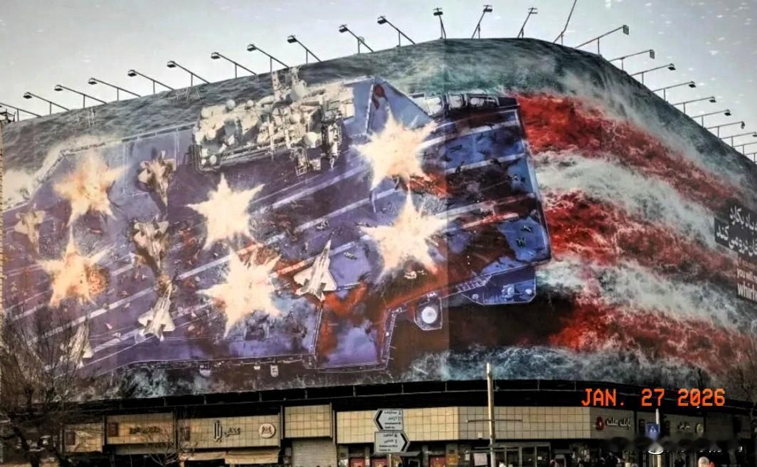 伊朗开始挑衅美国!伊朗这次没有升旗,而是在德黑兰市中心展示了一副巨大的壁画,画中是美国的航空母舰,航空母舰上有被导弹炸翻的战斗机以及满尸体的夹板,夹板上血流成河流到海上形成美国国旗条纹的图案。 图中有一行非常醒目的字,写的是,“种风者必收旋风”! 这就是在赤裸裸的挑衅美国,而且还不是一时冲动的挑衅,是伊朗对美方近期步步紧逼的强势回击。 1月美方十天两度加码制裁,8家能源实体、9艘油轮遭拉黑,还派“林肯”号航母携舰载机抵波斯湾施压,白宫放话“所有选项都在台面上”。 壁画就是最直白的警告,把美方霸权行径的后果摆到明面上。 深层看,这是不对称博弈的高招。伊朗深知硬拼军事不占优,用壁画打舆论战,既鼓舞国内士气,又向外界揭露美方霸权本质。 美方多年在中东煽风点火,制裁致伊朗通胀飙至42.2%,民生承压,如今伊朗用“种风收旋风”亮明态度。 美军虽摆航母威慑,但兵力远不足开战标准,盟友也不愿配合,伊朗精准拿捏其软肋敢高调叫板。 这挑衅背后,是反霸权对强权的公开对抗,也是对美方单边行径的彻底反击。伊朗怒批美国 美国对伊朗开战