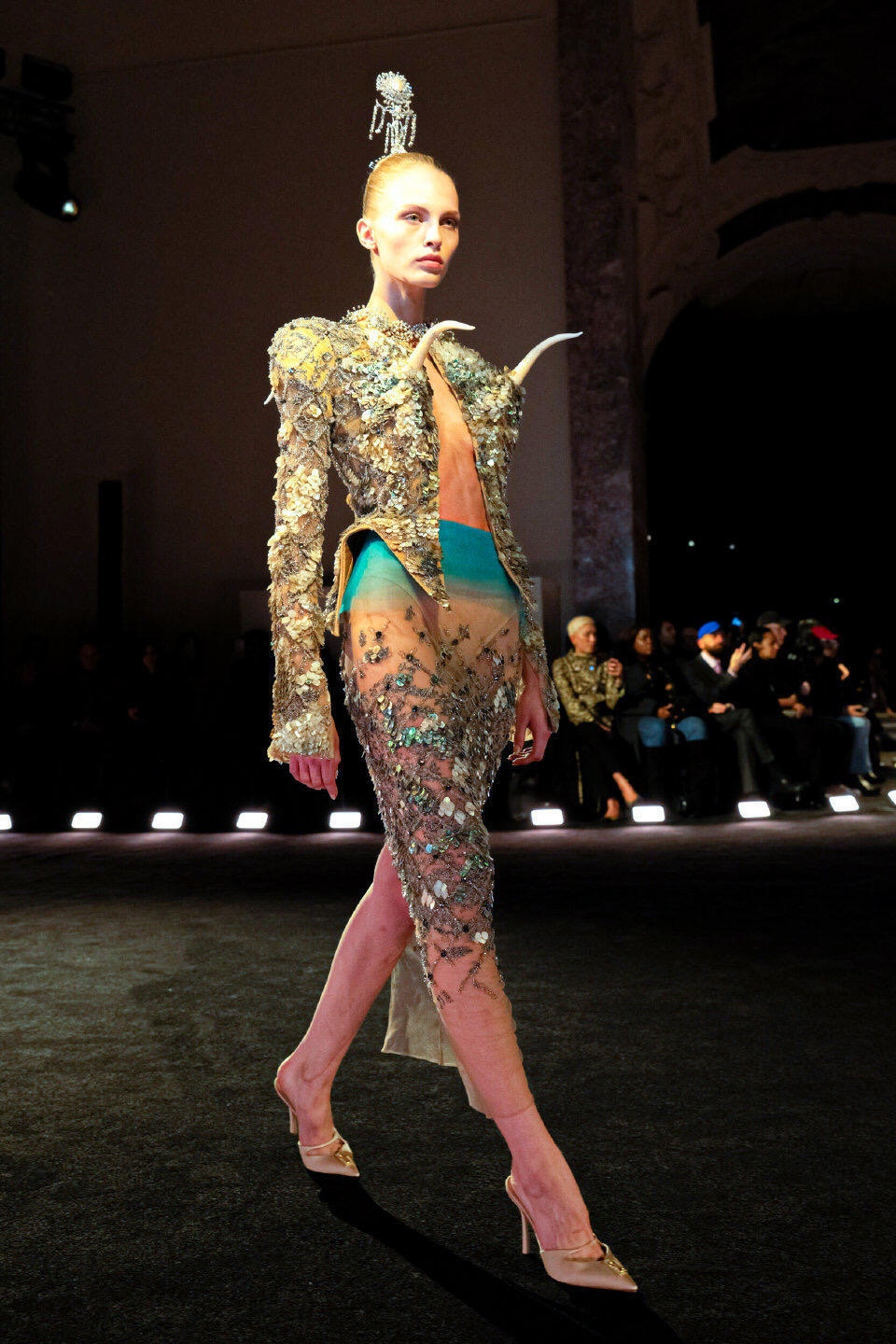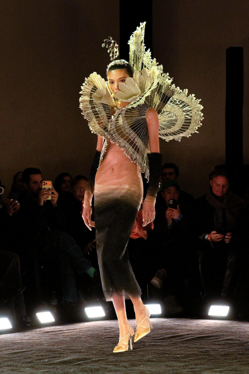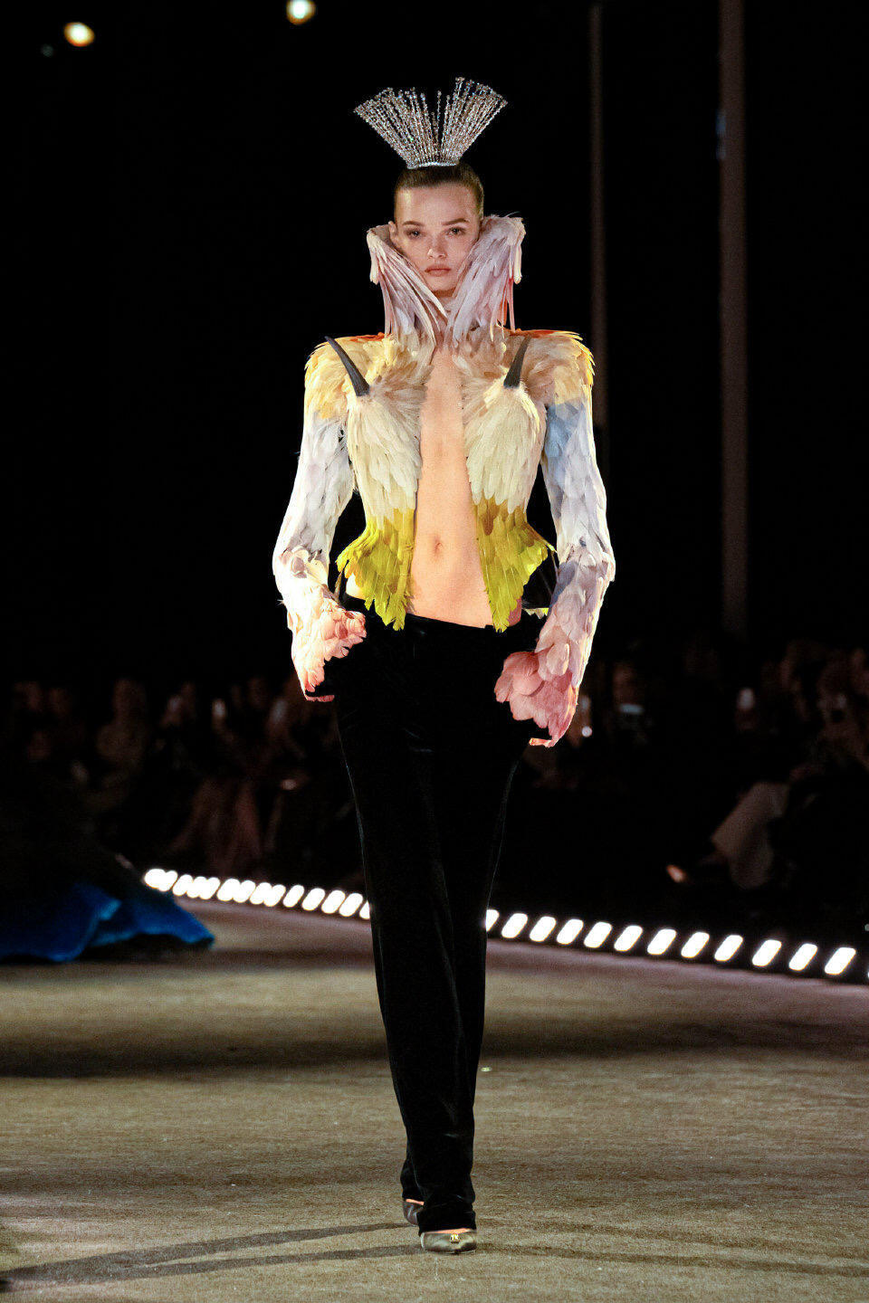 巴黎高定时装周大秀直击 Schiaparelli2026春夏高定在巴黎高定周上,Schiaparelli以“痛苦与狂喜”为主题,用一场充满超现实感的大秀震撼开场。设计师Daniel Roseberry从西斯廷教堂的静修体验中汲取灵感,将羽毛、蝎尾、树脂喙部等奇幻元素融入服装,打造出如同神话生物般的夸张廓形。真丝与手工羽毛的碰撞,让每件作品都成为行走的艺术,既有宗教般的神圣肃穆,又带着原始野性的视觉冲击,为高定周带来充满力量感的开篇。