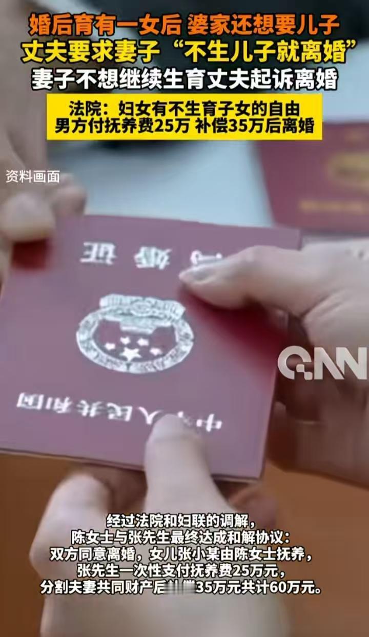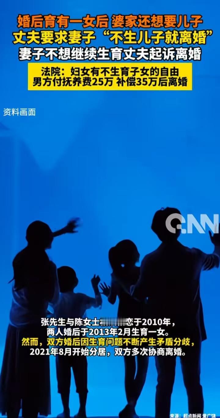 这个判决结果让很多人拍手称快!女人不是生育机器,有决定生不生的权利,男方威胁不生儿子就离婚,这下如男方所愿,离婚了女人自己可以好好带女儿,男方可以再婚生儿子去 现在二胎三胎都开放了,为什么很多人还是不愿意生?经济原因占大部分,更多的是女性在考虑,这个男人,这样的家庭,值不值得我再生一个 很多家庭里,孩子生出来感觉是给女人一个人生的,带娃管娃,还要上班做家务,经济受影响家人不管,明明一大家人,却没人帮衬,过的像单亲妈妈,像这样的还生什么呢,给自己找麻烦吗?更不要说这种重男轻女的家庭,二胎如果还是女儿呢,继续生吗?如果生了儿子,大女儿的境遇也可想而知 这个法院判决很有人情味,女性有自己决定生育的权利,还有一次性支付了25万的抚养费,也是相当好的结果,毕竟离婚后抚养费拖着不给的太多了 对比那两起,一个宫外孕切除子宫,还有一个流产两次没生育成功,被老公起诉离婚,还判离婚返还部分彩礼的,这个真的让人称赞! 图片源自网络,侵权必删