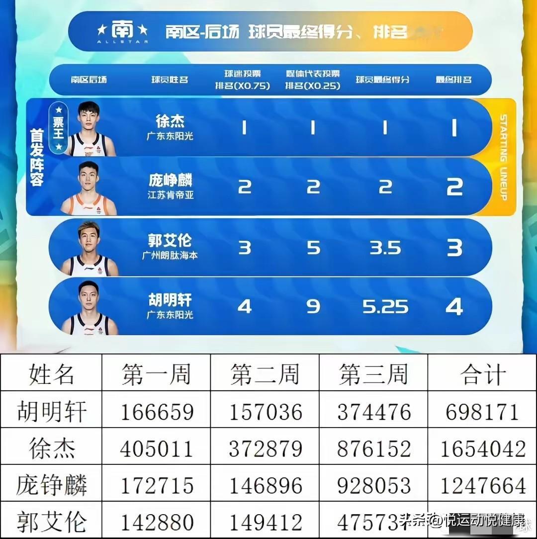 徐杰票王背后的隐藏大佬!广西球迷投票战斗力封神。 原来徐杰的全明星票王,藏着广西老表的神助攻!谁能想到庞铮麟第三周直接飙出92万票,这数字比胡明轩三周票数加起来还猛,广西球迷的投票热情直接拉满天花板! 以前总以为徐杰的票都是广东球迷撑起来的,直到看到庞铮麟、廖三宁这两位广西籍球员的票数才懂,广西球迷玩投票是真的拼,投自家球员的同时顺手把徐杰也安排得明明白白。两广不愧是一家人,这神仙应援,直接把CBA全明星投票玩出了新高度,感谢广西老表!
