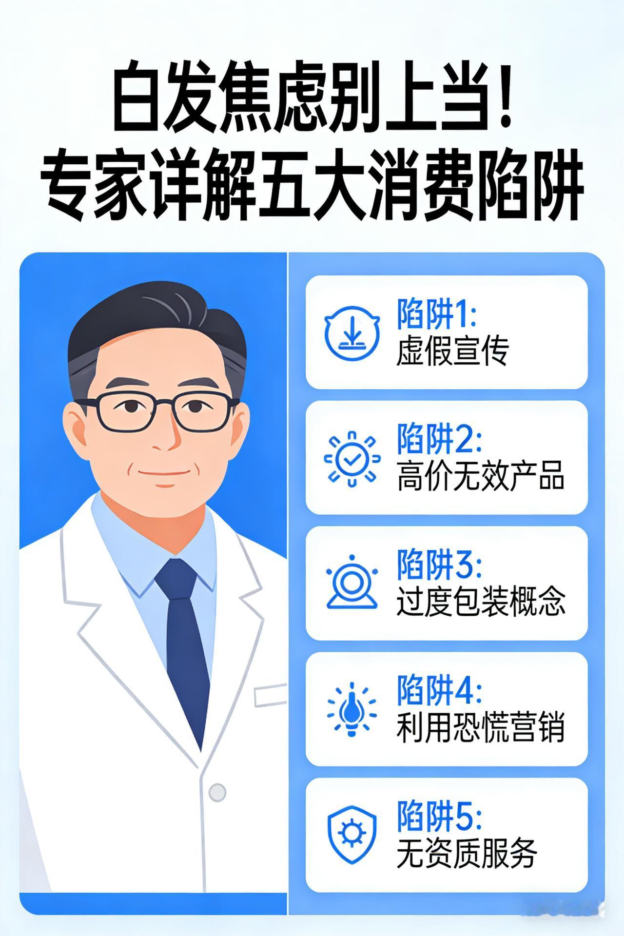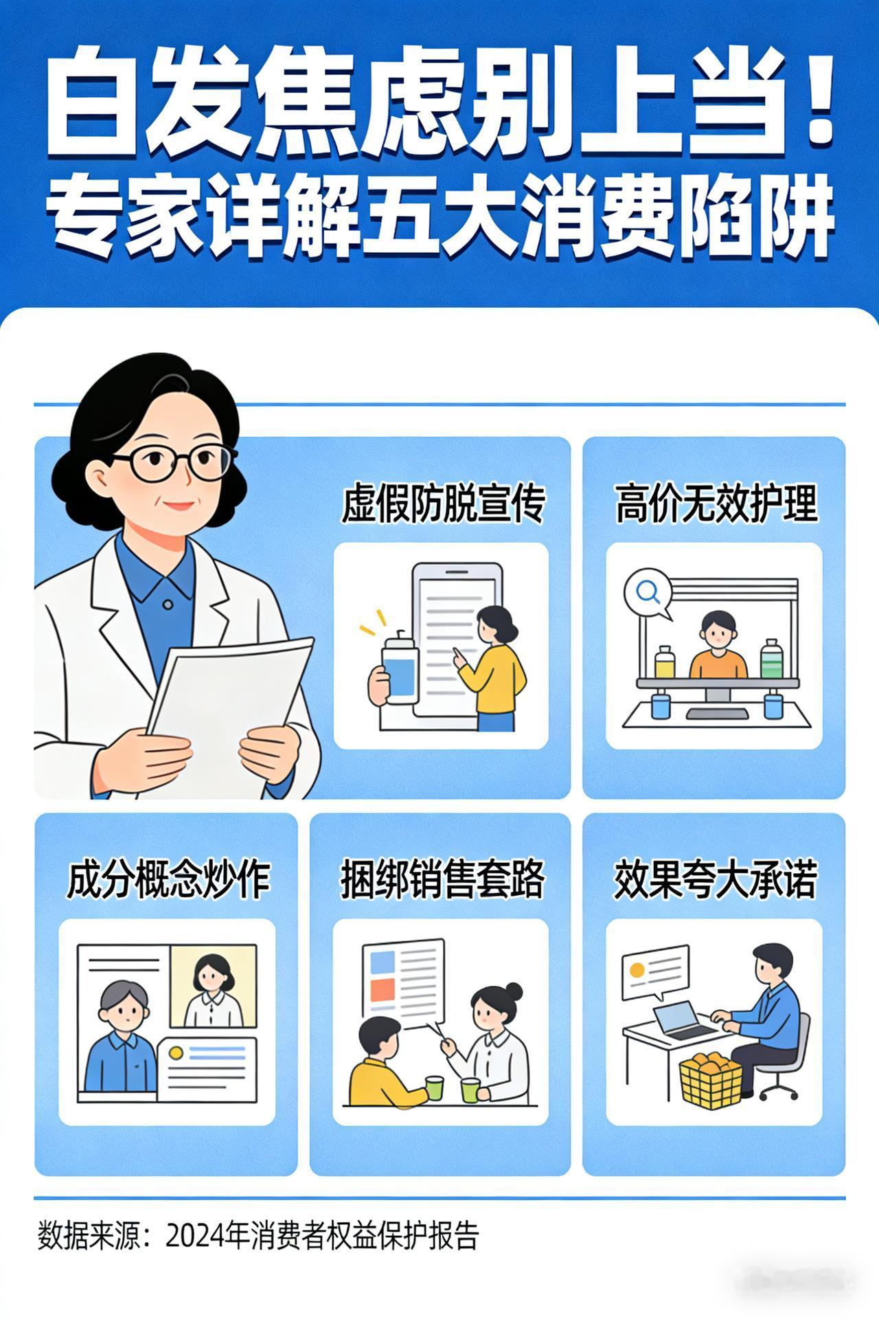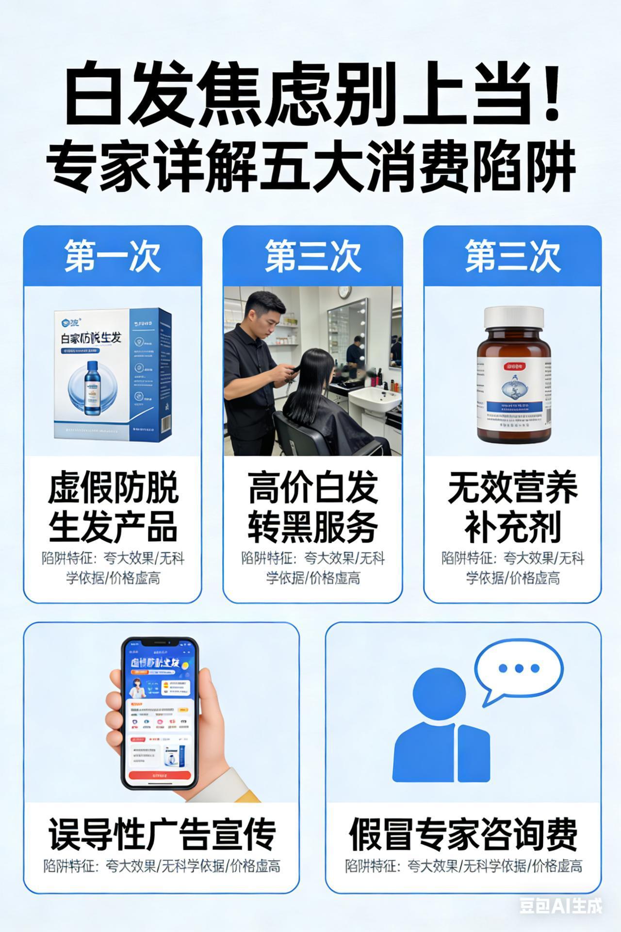 白发焦虑别上当!专家详解五大消费陷阱 标题:白发焦虑别乱投医!深扒5大致命误区与5大“智商税”陷阱 当第一根白发悄然出现,焦虑往往比白发本身更“致命”。别急着砸钱,先避开这些深坑! 【必知的5大科学真相】 1. “拔一根长十根”是假的:毛囊是独立的,暴力拔除只会引发毛囊炎,甚至导致永久性脱发。请用剪刀贴根修剪,温柔对待头皮。 2. 白发不等于衰老:亚洲人40岁后长白发生理常态,但“少白头”多由遗传决定。压力白发则是因皮质醇攻击了黑色素干细胞,调整作息后部分可逆,并非不可逆绝症。 3. 食疗无法“逆转”:黑芝麻、黑豆仅能补充营养,无法让已死亡的黑素细胞“复活”。盲目狂吃黑芝麻丸,反而会因油脂过高加重代谢负担。 4. 染发需警惕过敏而非致癌:合格染发剂致癌证据不足,但间苯二胺是强致敏原。记住铁律:做皮试、避开发根、一年不超过4次。 5. 何首乌是肝毒杀手:无论生熟,何首乌均含蒽醌类化合物,乱吃极易引发药物性肝损伤,甚至肝衰竭,绝不可当零食。 【必躲的5大消费“谣言”】 1. “洗黑”洗发水:头发长出头皮即为死细胞,任何洗发水都无法改变色素。所谓“洗黑”只是工业色素暂时附着或化学漂白,伤发质且易掉色。 2. “毛囊排毒”连环套:理发店常以“毛囊堵塞”为由,推销数千元的“深层排毒疗程”。这纯属伪科学,毛囊不需要排毒,只需要清洁。 3. PS恐吓检测:网络客服发来的“毛囊检测图”全是后期合成的恐怖特写,目的是制造“不治就秃”的恐慌,逼你下单。 4. 纯植物染发陷阱:号称“天然植物”的染发粉,往往着色力极差,且植物成分(如凤仙花、芦荟)同样可能致敏,频繁使用只会让头发如枯草。 5. “白发转黑”特效药:全球目前尚无获批的黑发特效药。所有宣称“7天见效、根治白发”的口服产品,多添加了违禁成分或仅仅是淀粉丸。 结语: 白发是岁月的馈赠,也是健康的晴雨表。与其交“智商税”,不如补充B族维生素、按摩头皮、规律作息。坦然接受自然变化,或选择正规染发,才是对秀发最大的温柔!