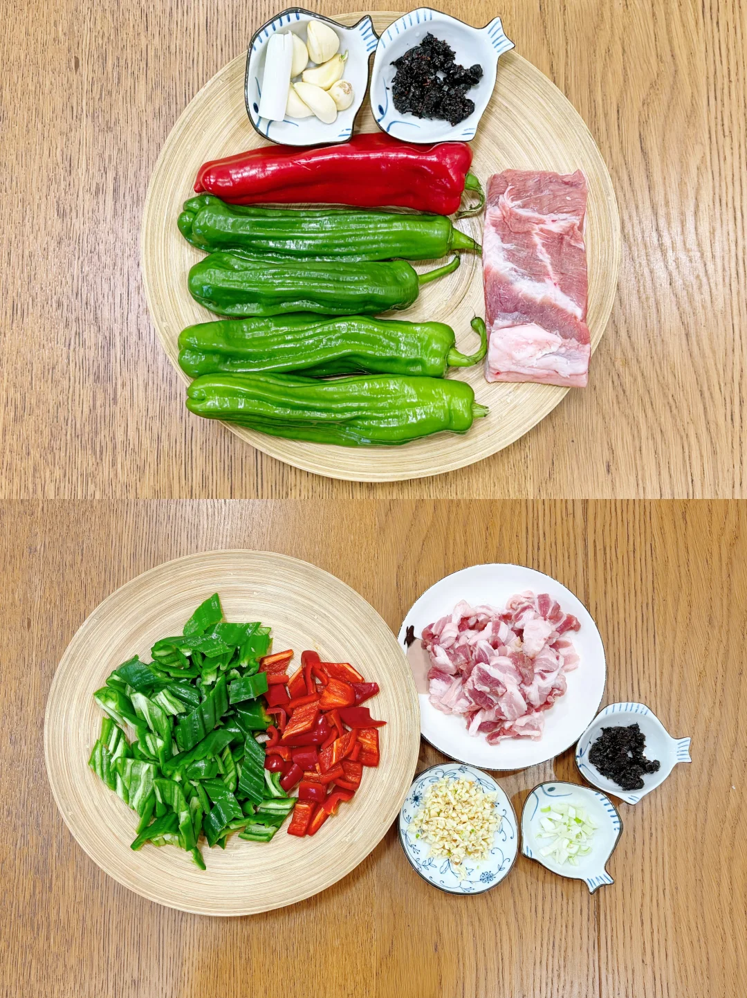 【主料】 皱皮辣椒4根,红辣椒1根,带皮五花肉250克