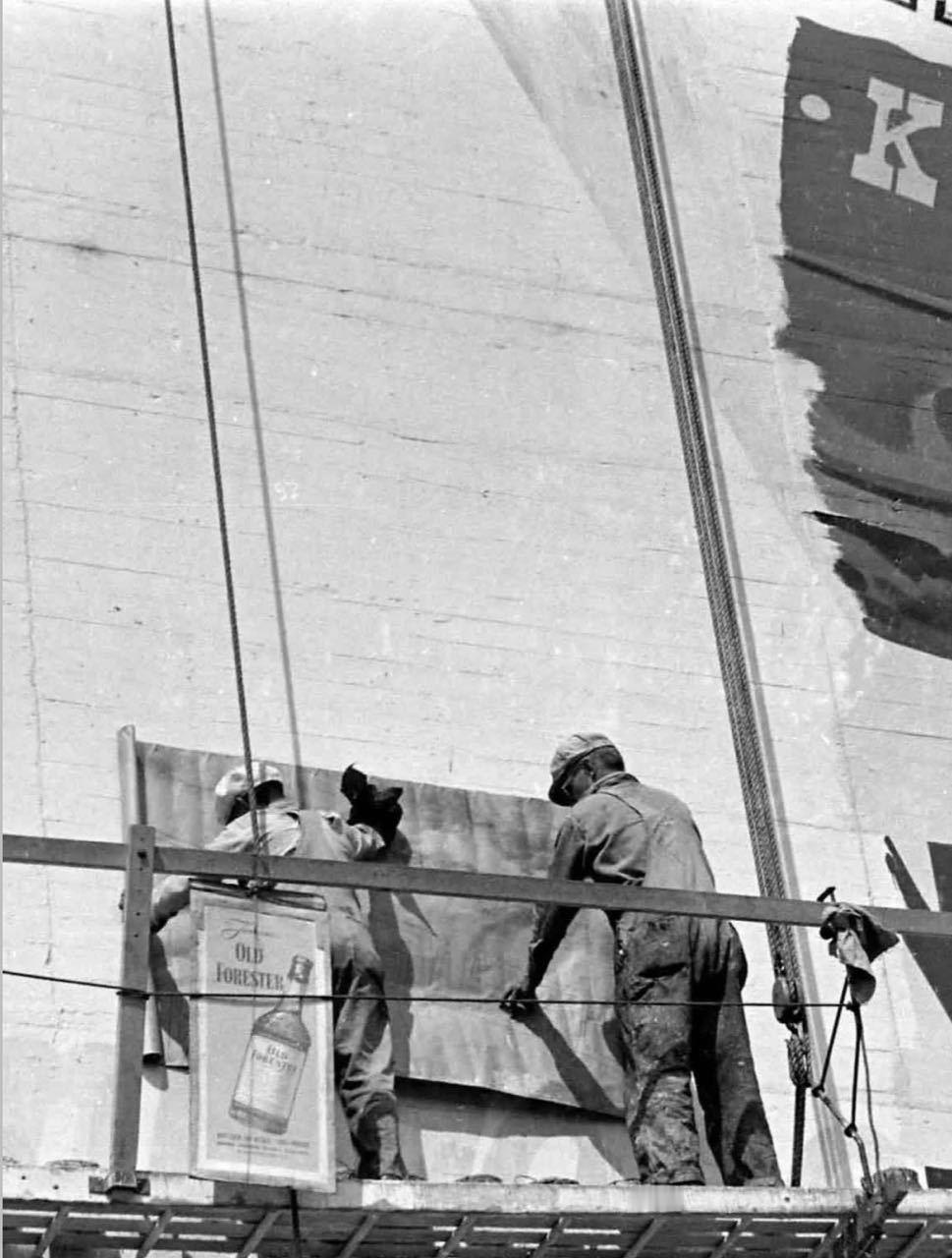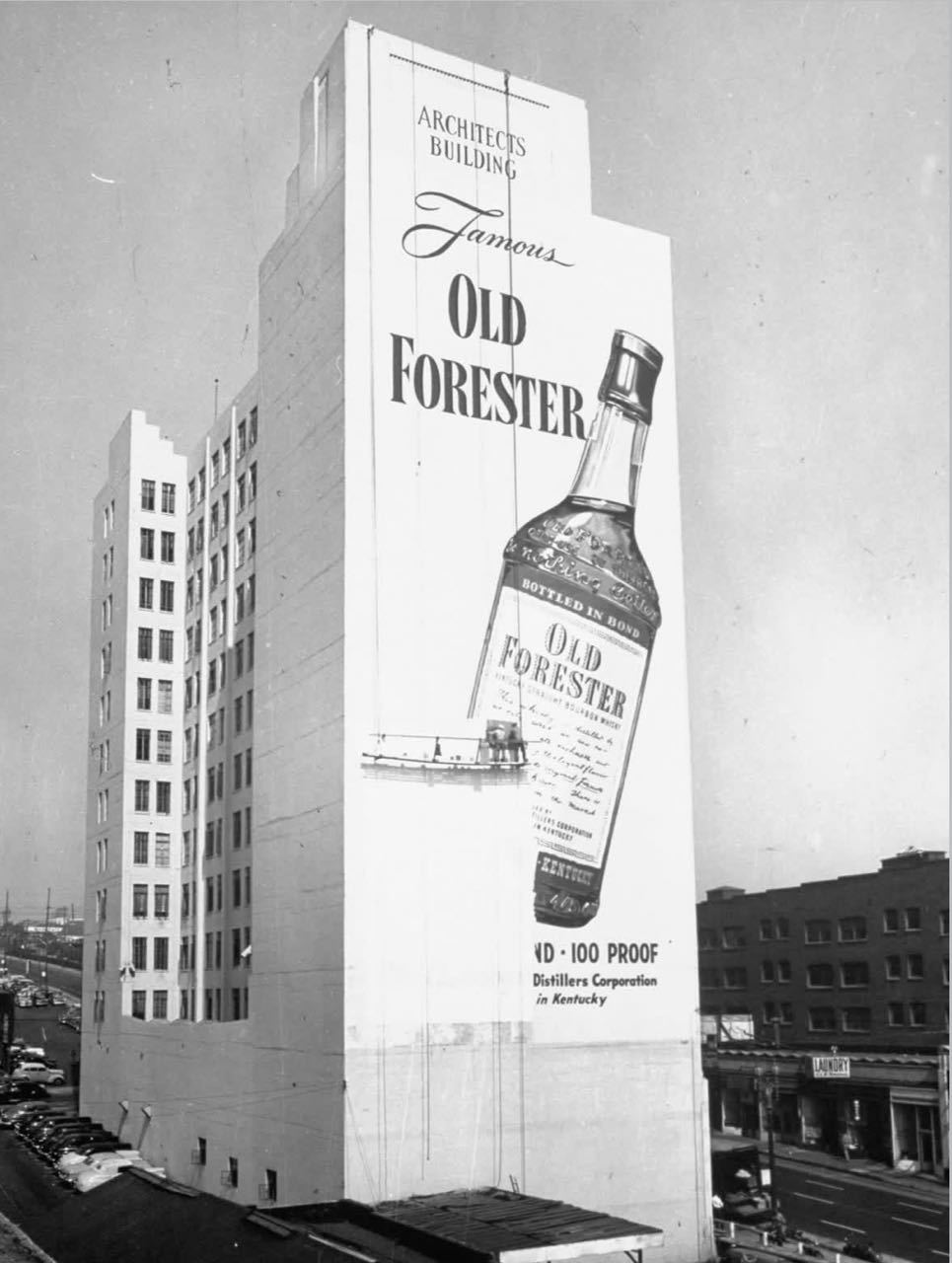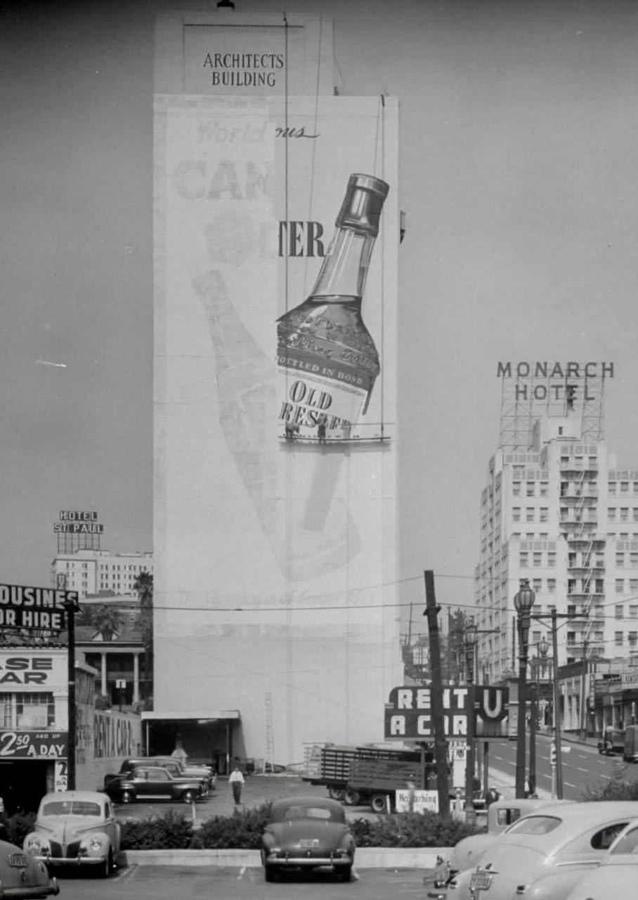 【来自投稿】1948年 加州洛杉矶,绘图师在一栋大楼上绘制“老森林人”牌威士忌酒的广告 “老森林人”是1870年创立于美国肯塔基州的威士忌品牌 ,至今依然是颇受欢迎的威士忌品牌,2025年品牌举办了150周年庆祝活动 这栋大楼名叫建筑师大楼,建于1920年,在1969年拆除