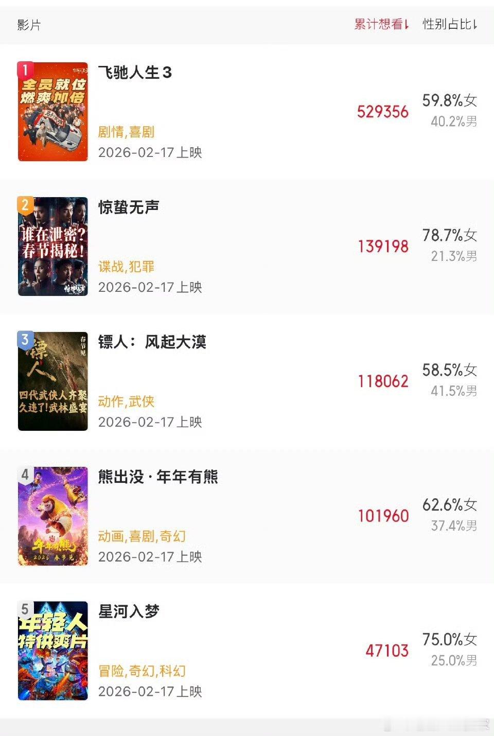 2026春节档目前阵容:《飞驰人生3》韩寒、沈腾《惊蛰无声》张艺谋、易烊千玺、朱一龙《镖人》袁和平、吴京、谢霆锋、于适《熊出没·年年有熊》《星河入梦》韩延、王鹤棣、宋茜