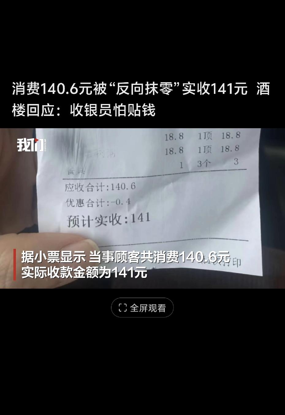 万万没想到!湛江一男子在酒楼吃早茶,结账后发现遭遇“反向抹零”。当事顾客共消费140.6元,实际收款金额为141元? ()湛江一男子跟平时一样去家附近的酒楼喝早茶。一顿饭吃下来,花了140块6。结账的时候也没觉得有啥,回头一看小票,就发现不对劲了。 小票上明明写着“应收140.6元”,可“实收”那一栏,清清楚楚是141元。 这就奇怪了,现在不都是手机支付吗,几毛几分的都能精确扣,怎么还多出来4毛钱? 男子心里很不舒服,就把这事反映了出来。 事情一传开,涉事的酒楼赶紧出来说话了。他们的解释是,这是收银员的个人行为。理由是,收银员“怕贴钱”。 意思是,如果系统设置或者因为什么原因,收银员可能需要自己垫付零头,所以他索性就“向上取整”收了。 酒楼说,因为多收的金额“较少”,他们也没去追究这多收的4毛钱最后去哪了,但是已经对那个收银员进行了“批评教育”。 并且表态,如果被多收钱的顾客找回来,他们愿意退款。 但是这事现在不只是顾客和酒楼之间的事了,辖区市场监督管理部门的工作人员已经表示,会到店里去现场核实这个情况。 事情发生后,不少网友说,“这不是4毛钱的事,这是规矩的事” 。现在手机支付一分一厘都能算清楚,凭什么替我决定“四舍五入”?尤其是入的永远是我的钱。 也有人试着理解,说以前用现金找零麻烦,现在可能有些老系统或者习惯没改过来。但理解归理解,还是认为不对,“不能把方便建立在顾客吃亏上” 。 还有网友开玩笑说,“这下好了,省了4毛钱,可能得花几百块做公关” 。为这点小利丢了口碑,不值当。 你是怎么看待这种方向抹零的?