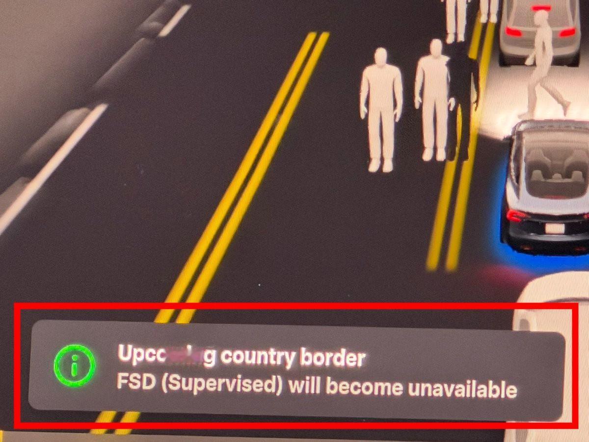 特斯拉FSD又增新功能 昨天分享过,马斯克在达沃斯谈论上给出暗示,欧洲和中国的FSD落地监管审批有望在一个月后获批。紧接着又有博主发现一个细节,他将一辆特斯拉开到了美墨边境,即将进入墨西哥的时候车辆跳出一个提醒:即将来到国家边境——FSD将不可用。 由于监管部门要求,一旦特斯拉FSD进入另一个国家,必须遵守当地法规,即使另一个国家也允许FSD使用,但是特斯拉也必须在过境期间暂时关闭该功能,确认已位于批准运营的位置。 这一点在欧洲将会是非常必要的功能,因为欧洲众多国家相邻,在那边过境和咱们穿城一样频繁。所以特斯拉这个新提醒的出现,被解读为是为了FSD在欧洲最终获批做的准备之一。 特斯拉一直在西班牙、法国、英国和其他欧洲国家测试FSD,并计划继续扩大这一努力,争取早日在这些国家获批。【来自懂车帝车友圈】