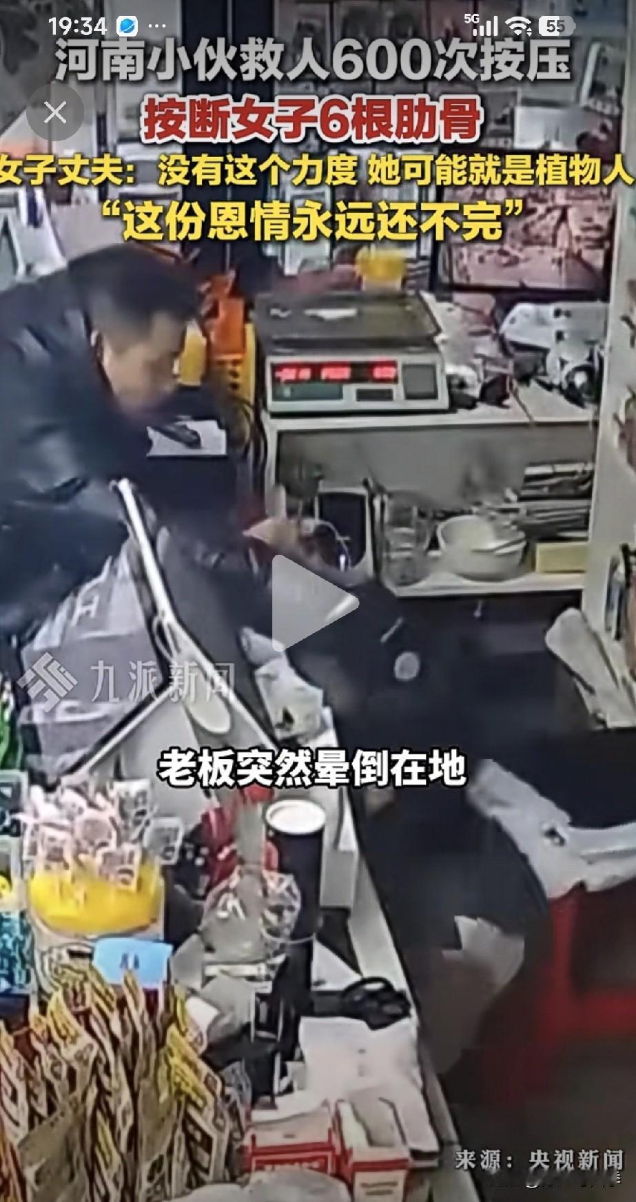 河南小伙救人按断老板娘六根肋骨,丈夫感激不尽称这份恩情永远还不完! 河南小伙张晓国在苏州一家小超市买东西,老板给他免了一块钱,说话之际,老板娘突然晕倒在地,张晓国马上打了急救电话! 接线员告诉他要做胸部按压600次,坚持到救护人员到才能停止,他按着接线员的节奏开始按压和穿插人工呼吸,救护人员赶到后他才停止! 后来老板娘的丈夫说非常感谢小伙子,如果不是那按压,妻子肯定就是植物人了,这份恩情永远还不完! 这份双向的美好感动着我们,如果都是这样,这个世界更多一份美好! 河南救人 图片来源九派新闻