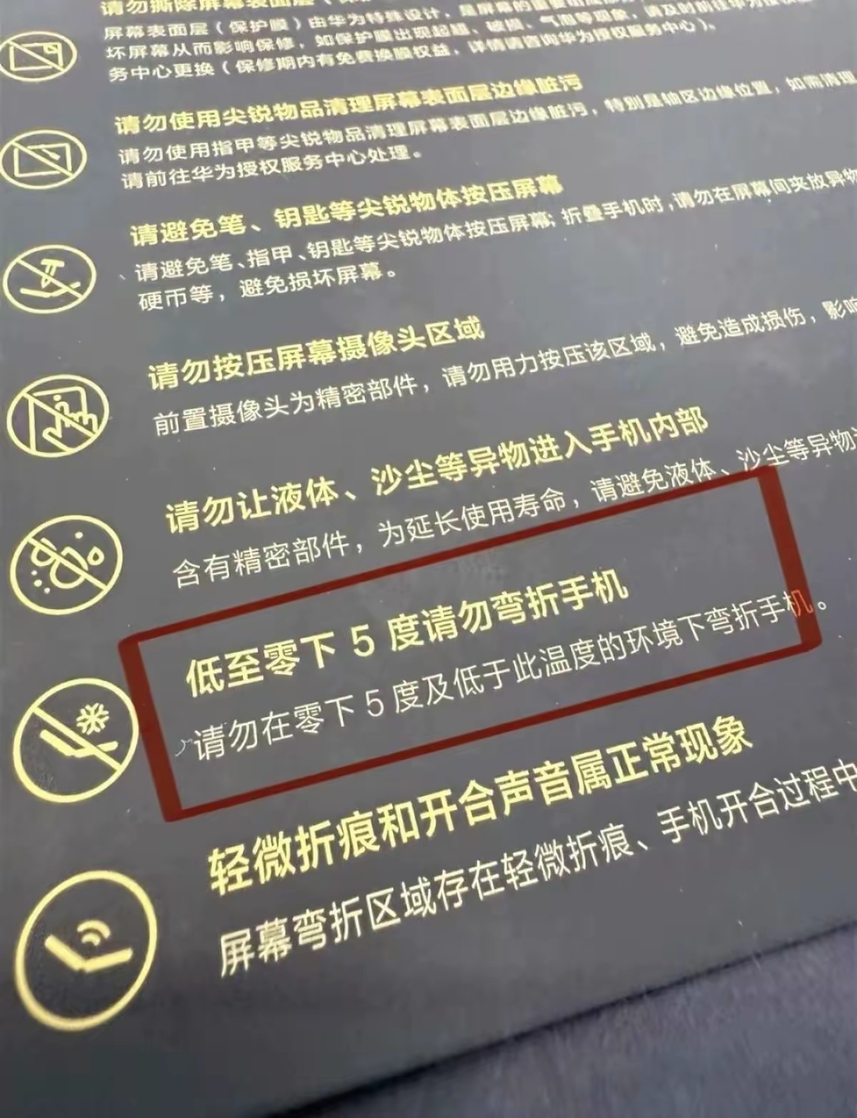 网友吐槽折叠屏手机在东北被冻坏一般折叠屏手机开箱时都有使用提醒,低温环境下尽量还是不要弯折手机。