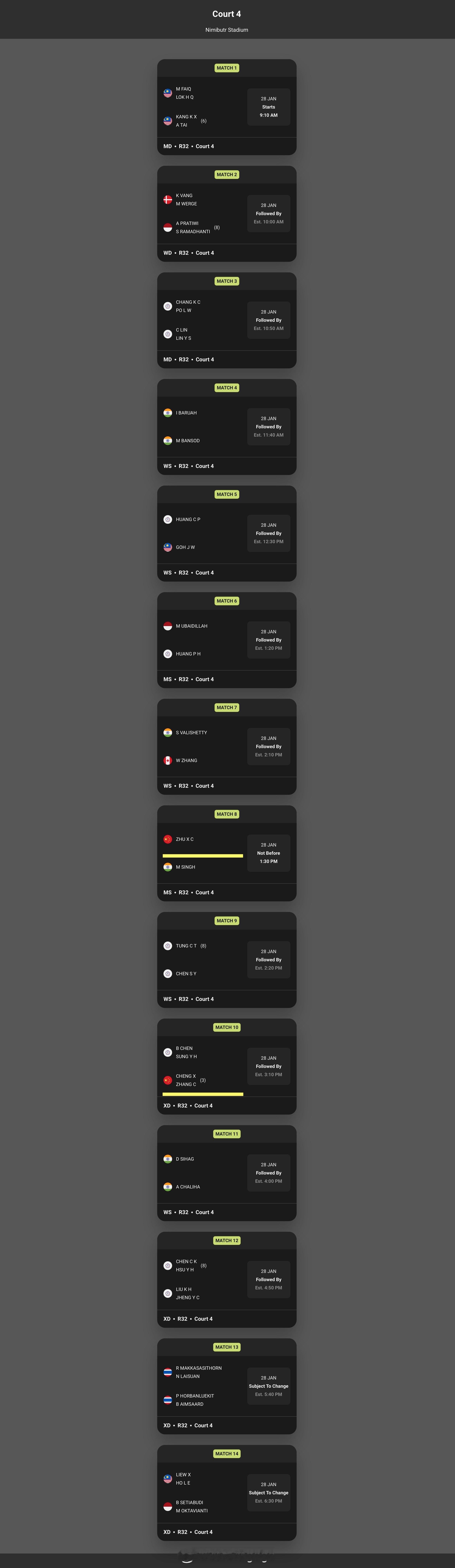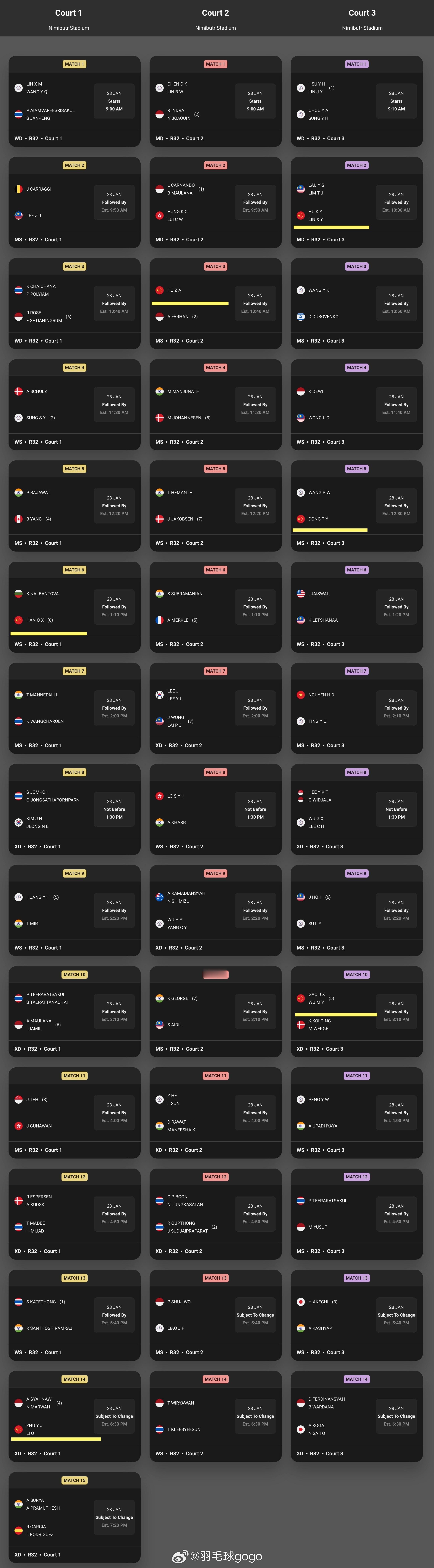 2026年泰国羽毛球大师赛 1月28日国羽对阵⏰10点1号场地第六场 女单 🇨🇳韩千禧vs纳尔班托娃🇧🇬第14场 混双 🇨🇳朱一珺/李茜vs阿姆里/妮塔🇮🇩2号场地第三场 男单 🇨🇳胡哲安vs法汉🇮🇩3号场地第二场 男双 🇨🇳胡珂源/林祥毅vs刘奕胜/林志健🇲🇾第五场 男单 🇨🇳董天尧vs王柏崴(中国台北)第10场 混双 🇨🇳高家炫/吴梦莹vs科丁/韦尔格🇩🇰4号场地第八场 男单 🇨🇳朱轩辰vs辛格🇮🇳第10场 混双 🇨🇳程星/张驰vs陈柏元/宋奕萱(中国台北)
