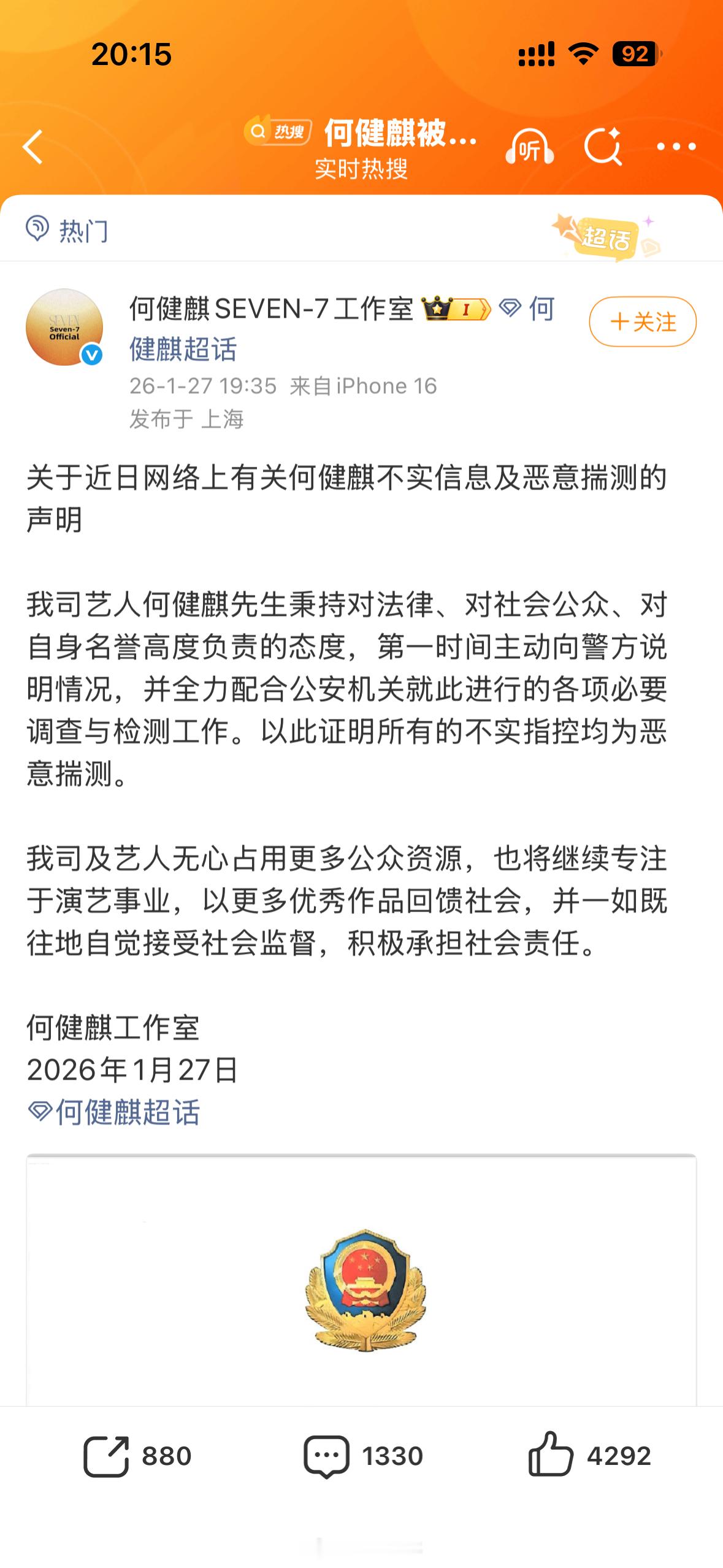何健麒工作室又出来回应了,但这不是答非所问,人家要求晒出来报警回执单和编号,你整