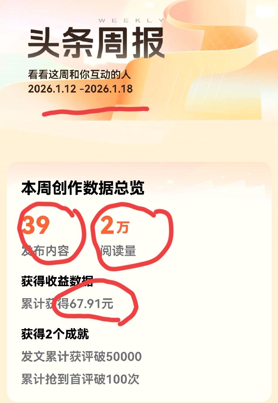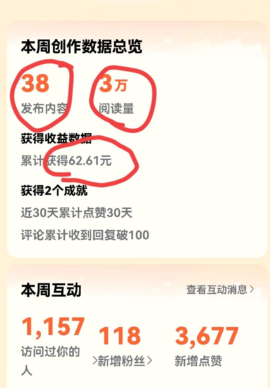 终于知道了头条为什么既要卡流量、又要降单价了,因为头条只肯给我60块。 这周的收益单价出来了,阅读量是3万,收益是62.61元,为了给我每周几乎固定的那60多元,头条只有控制我的流量,再降一下单价,每周60多元的薪资就名正言顺的实现了! 上周我的阅读总量是2万,收益是67.91,头条给的单价是3元,这周阅读总量是3万,收益只有62.61元,头条给的单价就是2元,头条是真有趣,报酬早就定下了,只要是天天出工了,保持好同样的日更数量,每周的报酬就是这个数,不可能冲出60多元的这个怪圈圈! 每周60多元、够买一点东西了,不过还是希望有所提高,不然就没有积极性了!