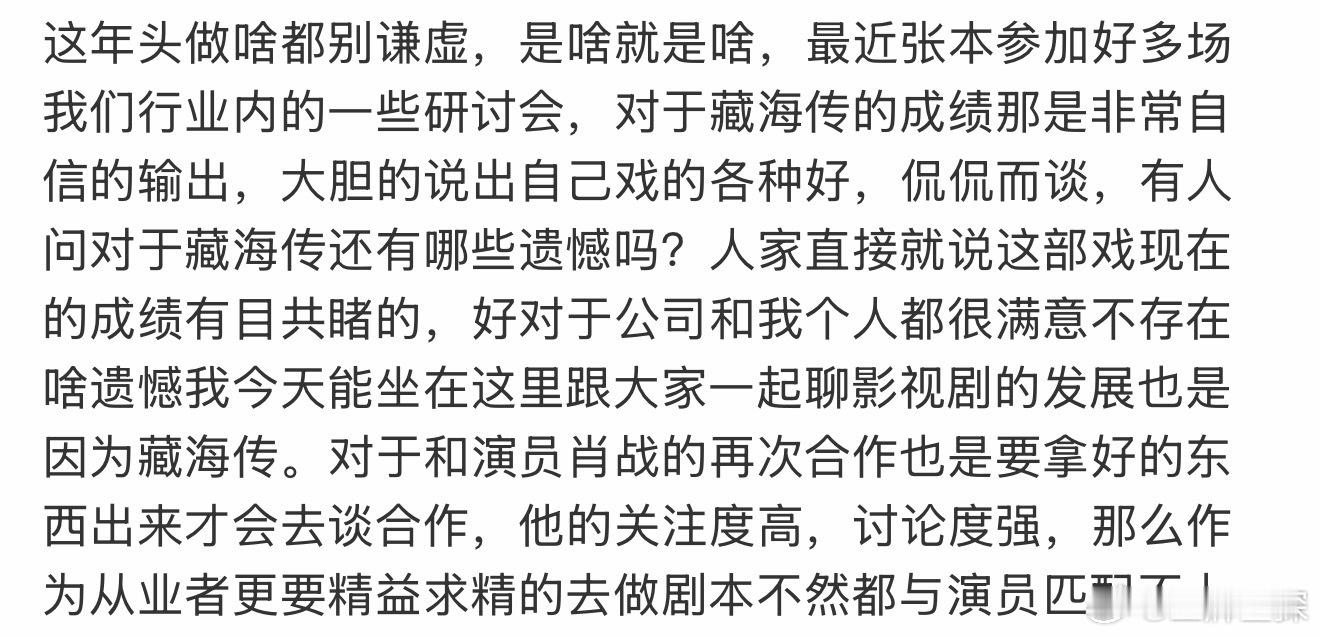 张本谈和肖战再次合作张本对于藏海传还有哪些遗憾 张本对于藏海传还有哪些遗憾,这部戏成绩就是有目共睹,很满意没有遗憾。若与演员肖战再次合作,也是要拿好的东西出来才会去谈合作,他的关注度高,讨论度强,那么作为从业者更要精益求精的去做剧本不然都与演员匹配不上。燥候二搭了,好本子四面八方来!