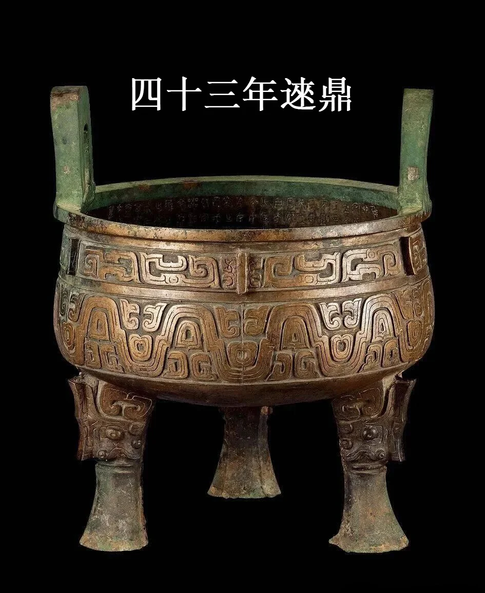 此次窖藏共出土27件西周青铜器,四十三年逨鼎是其中数量最多的一组,共10件收藏单位:宝鸡青铜器博物院形制尺寸:10件鼎大小不一,高58-22.6厘米,重44.5-3.9千克,形制纹饰统一,呈大小递减序列。造型规整,为大立耳,外侧饰鳞纹或重环纹、口沿宽而外折,下饰变形兽体)、垂腹较浅环带纹、底近平,三蹄足根部饰兽面纹,尽显西周晚期青铜器物的典型风格。