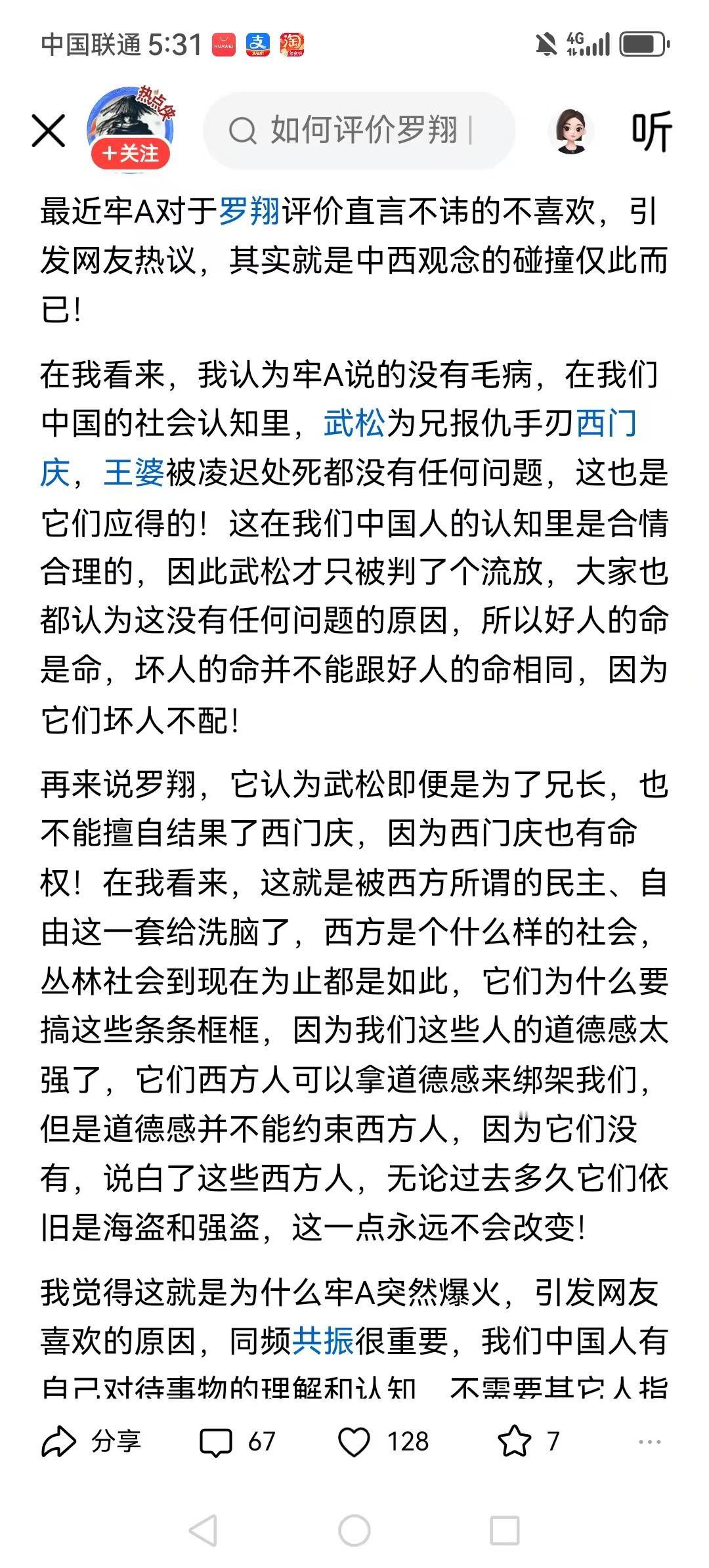 最近牢A对于罗翔评价直言不讳的不喜欢,西门庆当然怕武松手刃了他,西门庆当然希望武松被束缚住手脚而不敢手刃了他。 西方天天鼓吹人权,实际把人当作商品,本质还是奴隶社会那套。 主要问题是,法律为什么不制裁杀了武松兄长的人?这个才是重点啊! 当你践踏别人生命权的时候,你就没有了生命权,西方逻辑不通啊。 罗能说出这种话,说明他是典型的公知,屁股坐歪了的,作为律师没有道德底线了都。 法律只有在规则内才适用,而当法律不能主持公平正义了,那就会有人掀桌子。 西门大官人肯定欢迎武松拿起法律,去衙门去告官了。