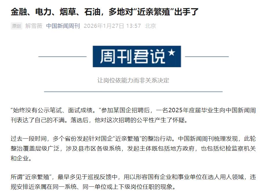 多地对“近亲繁殖”出手了,金融、电力、烟草、石油是“重灾区”。 过去一年来,全国多地发起针对国企“近亲繁殖”的整治行动。去年5月,湖北随县要求全面清查亲属裙带关系。7月,四川简阳市对1万余名在职干部职工开展全覆盖自查。12月,湖北孝昌县对6家县属国有企业338名干部职工开展全覆盖排查。 动作看起来很大,但似乎没看到什么排查结果,难道是不存在“近亲繁殖”吗?恐怕没那么简单,现在“近亲繁殖”越来越隐蔽了。 一个是“萝卜坑”式招聘,设置各种招聘条件,还说是合规合法。这两年频繁曝光这类事件,有些地方会去调查,有些地方直接说招聘过程完全合规。 另一个是你的子女来我的单位,我的子女去你的单位,相互合作,确实遵守了任职回避规则,根本查不出来。 像这种“近亲繁殖”问题最严重的就是市属、县区属国企,金融、电力、烟草、石油等系统尤为突出。 小地方社会关系密集,人员熟识,而且监管薄弱。所以,这个“近亲繁殖”的问题想解决,恐怕没那么容易。
