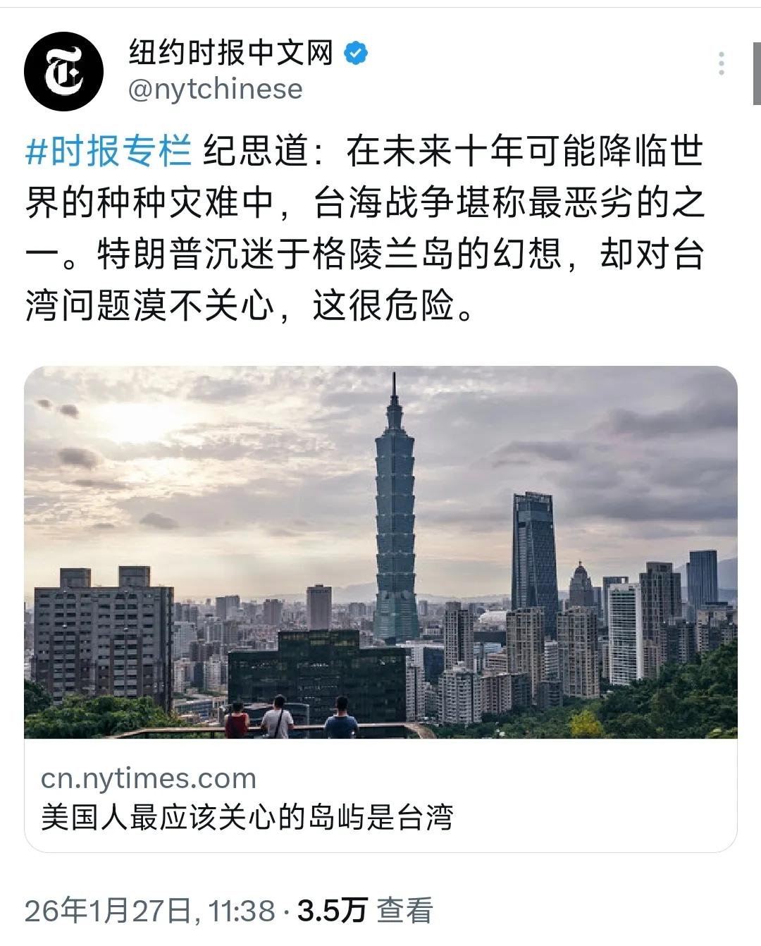 《纽约时报》中文网今天(1月27日)发表专栏作家纪思道的评论:“在未来十年可能降临世界的种种灾难中,台海战争堪称最恶劣的之一。特朗普沉迷于格陵兰岛的幻想,却对台湾问题漠不关心,这很危险。” 作为美国一位知名记者、政治评论家、《纽约时报》专栏作家,曾担任该报驻香港、北京及东京的首席记者,他曾两次获得美国新闻界的至高荣誉“普利策新闻奖”。但他哗众取宠,大肆渲染中美在台海必有一战,并称台军方已做好袭击福建的准备,被台防务部门斥之为“假新闻的制造者”。纪思道呼吁特朗普重点关注台湾问题,现在的美国拿什么去管台湾问题?纪思道唯一对中国做对的一件事就是,他在2011年初发文称,“强有力的历史证据表明,钓鱼岛是中国的”。