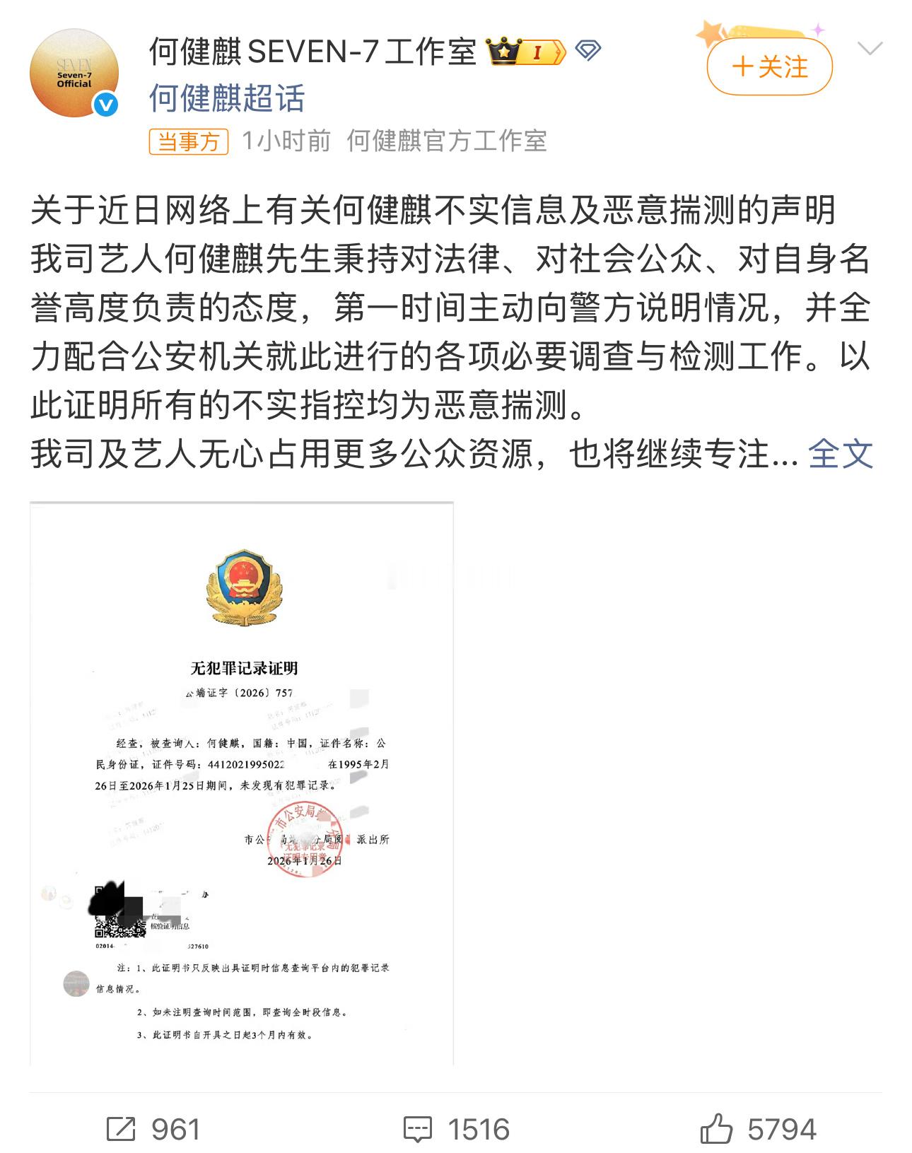 何健麒公开无犯罪记录证明工作室发布的《无犯罪记录证明》由公安机关于2026年1月26日出具,明确标注何健麒在1995年2月26日至2026年1月25日期间“未发现有犯罪记录”,并注明“如未注明查询时间范围,即查询全时段信息”。该证明自开具之日起有效期3个月